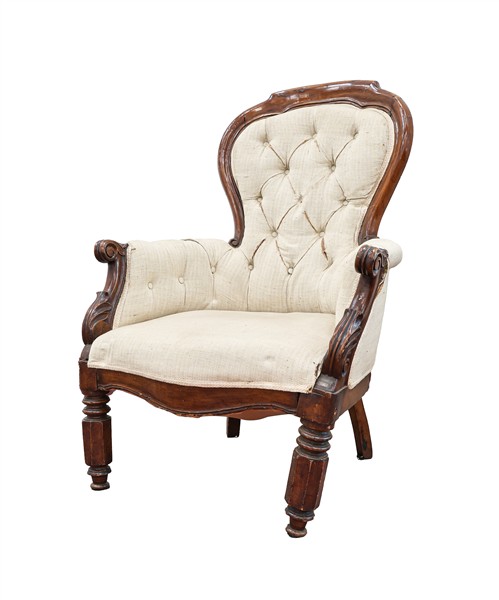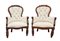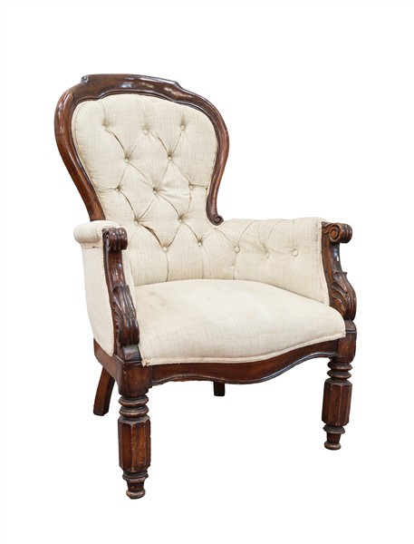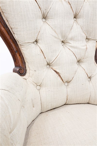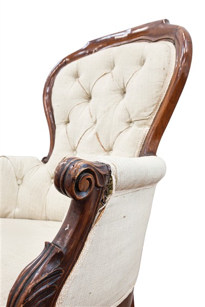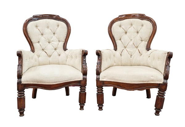 Coppia di poltrone Luigi Filippo in noce di forma mossa, braccioli scanalati terminanti a ricciolo, montanti con motivo fogliato all'attacco, rivestimento in tessuto beige. Secolo XIX (difetti)