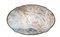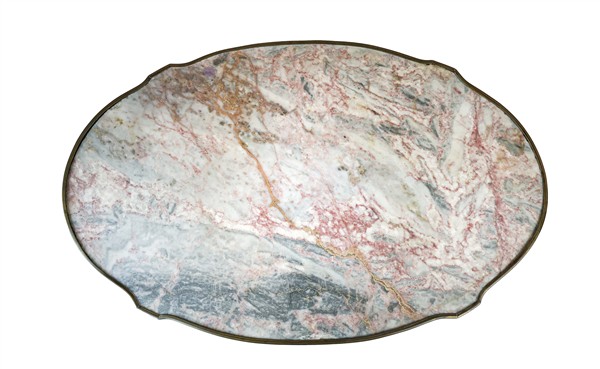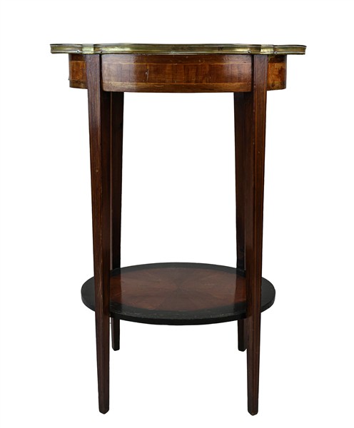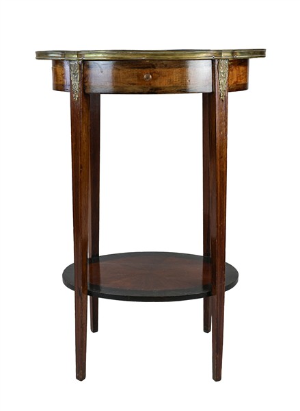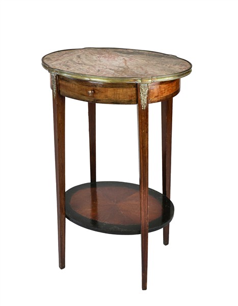 Gueridon di forma ovale in legni vari a due ripiani, un cassetto nella fascia e piano sagomato in marmo incassato, profili e guarnizioni in metallo dorato (cm 54x75x36) (difetti)