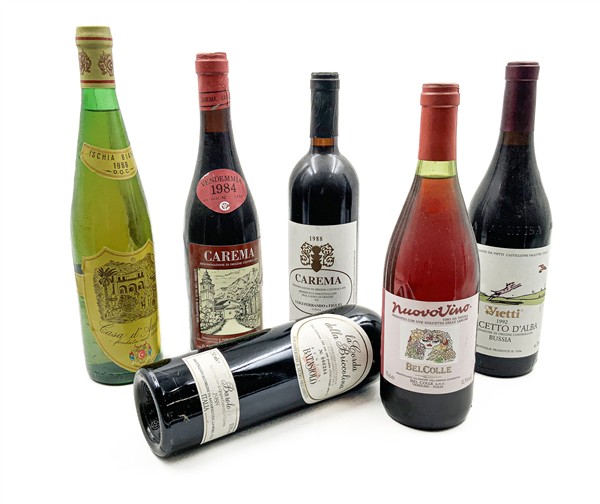 Lotto composto da oltre 20 bottiglie di vino in tre cartoni, tra le quali Nuovo vino belle Colle, Carema