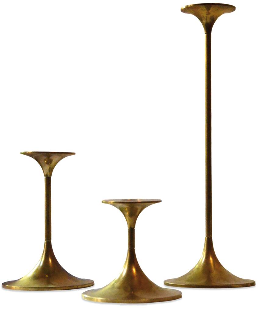 Max Bruel (Copenhagen, 1927-1995) Tre candelieri Hi Fi Produzione: Torben Orskov, 1960 Fusione di ottone cm 9 h, 13,5 h, 27 h x 9 diametro