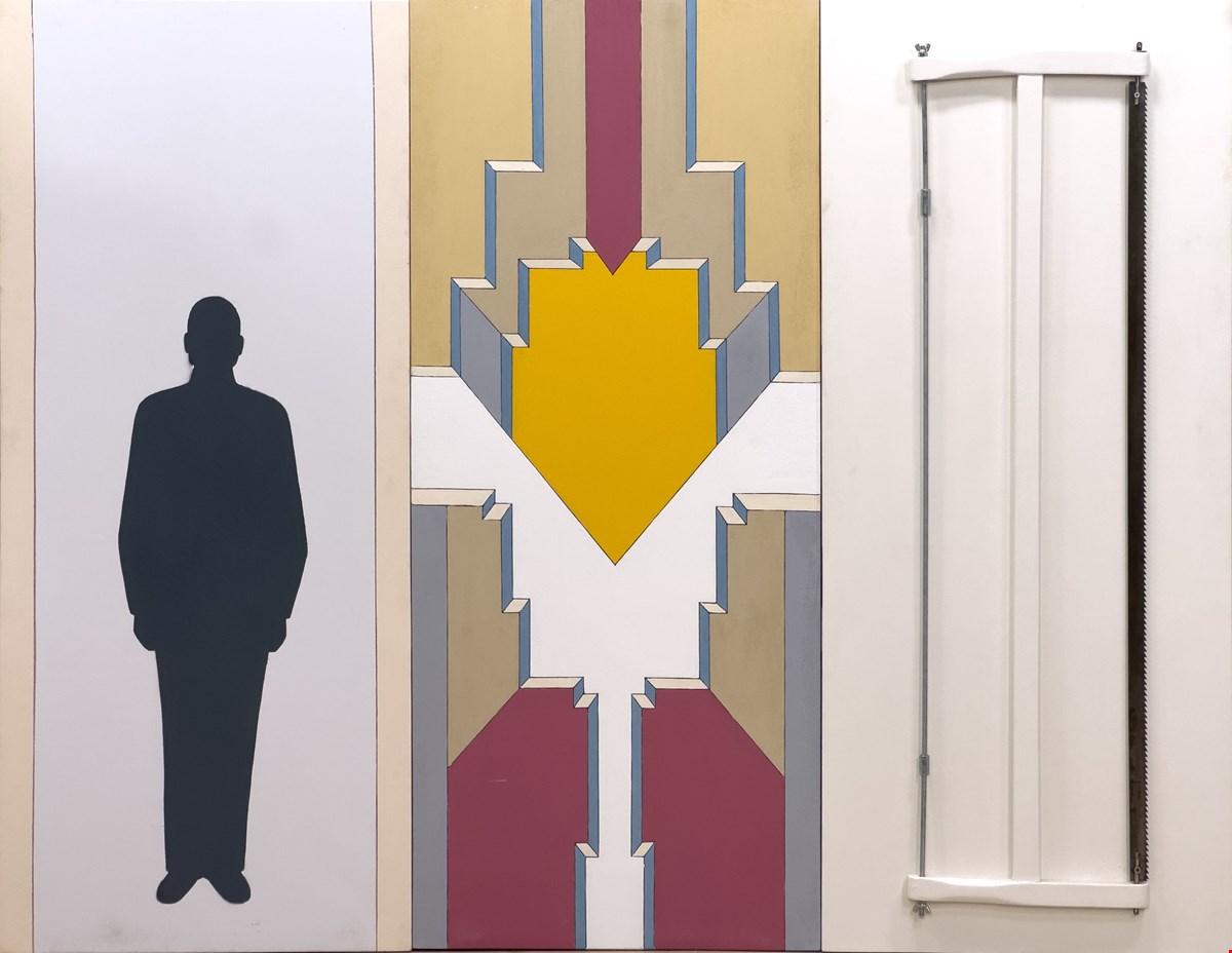 Renato Mambor, Segare e gesti quotidiani, 2007, acrilico su tela, cm 140x180, Trittico, Esposizione presso la mostra 'Il masso inamovibile' Abbazia Montecassino - 2022, Firma - Titolo - Datazione al Verso