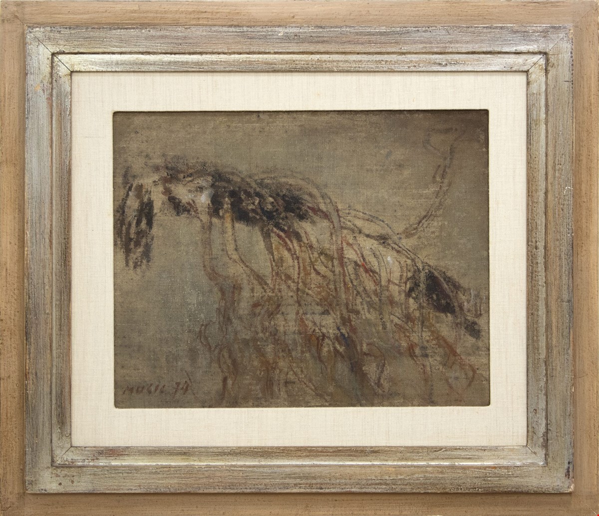 Zoran Music, Motivo vegetale, 1974, Acrilici su tela, cm 33x41, Archivio presso Archivio Barbarigo Cadorin Music, Datazione al Recto, Tracce evidenti di un precedente dipinto al Verso, Cornice in omaggio