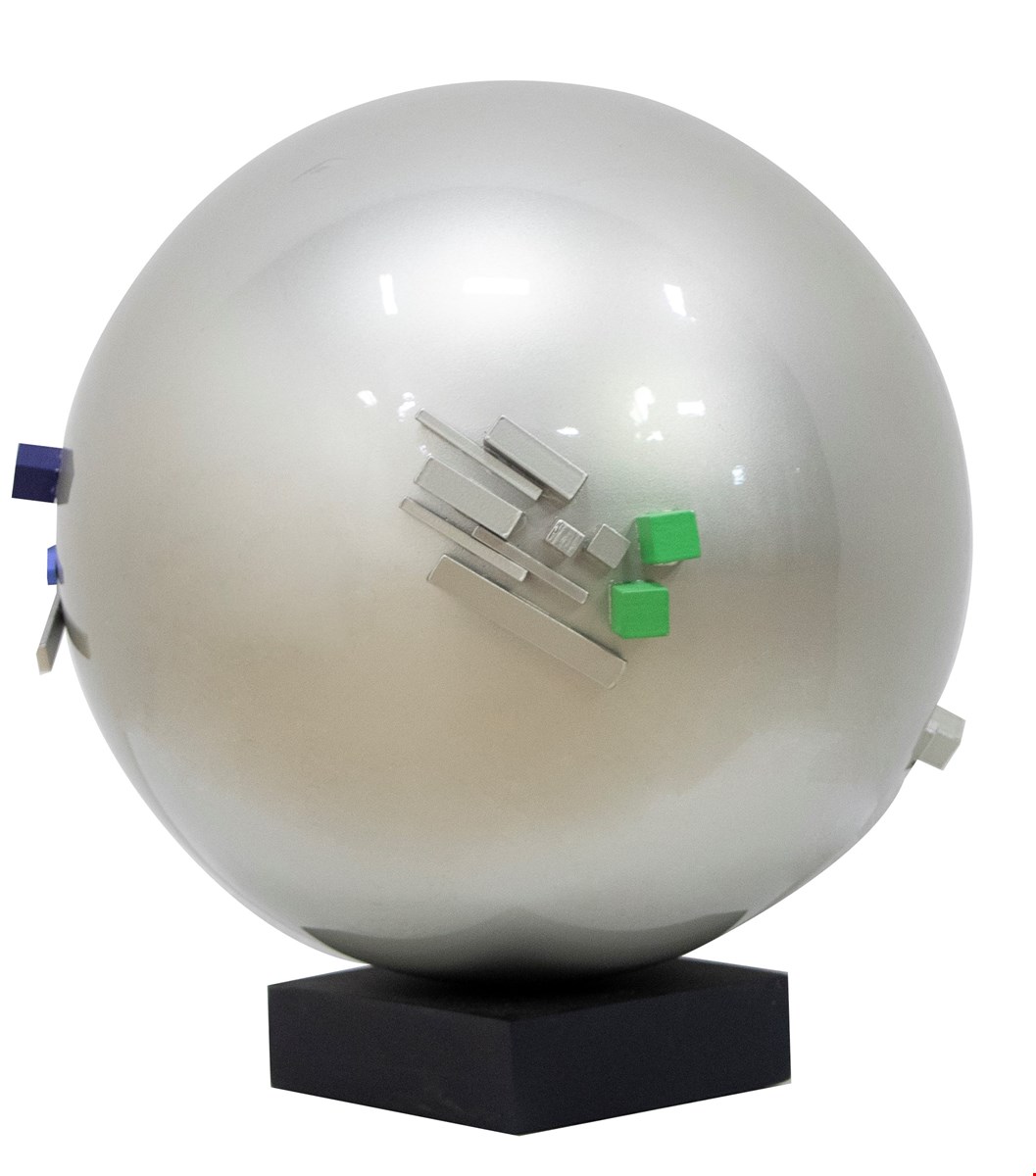 Beppe Bonetti, Variazioni su un errore di Parmenide, 2011, Acciaio verniciato a forno, cm 35, Archivio Generale Beppe Bonetti, Pubblicazione sul Catalogo Variazione su un errore di Parmenide - Beppe Bonetti, Cartiglio descrittivo sulla base