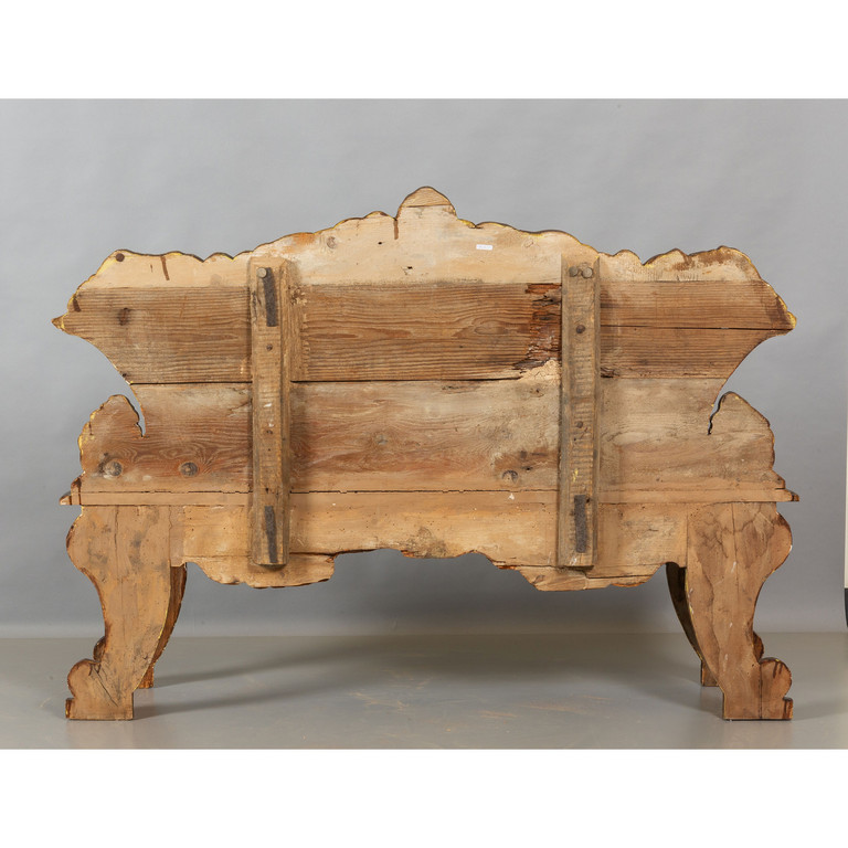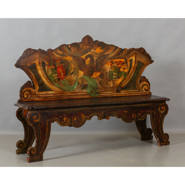 Coppia di cassapanche con schienali dipinti in policromia con stemmi araldici