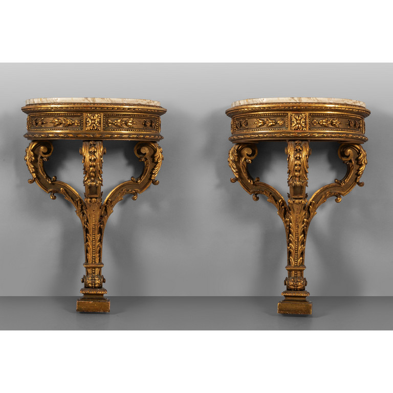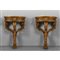 Coppia di console d'aplique in legno intagliato e dorato piano in marmo bianco inizi sec.XX