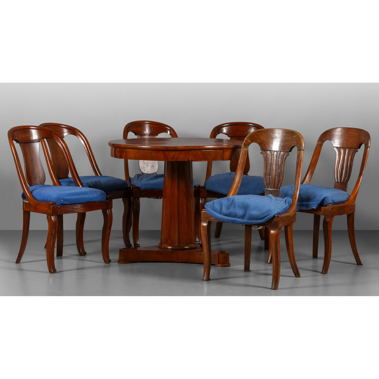Tavolo da centro in noce a due cassetti con sei sedie a gondola (4+2) I metà sec.XIX