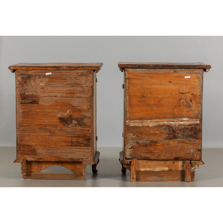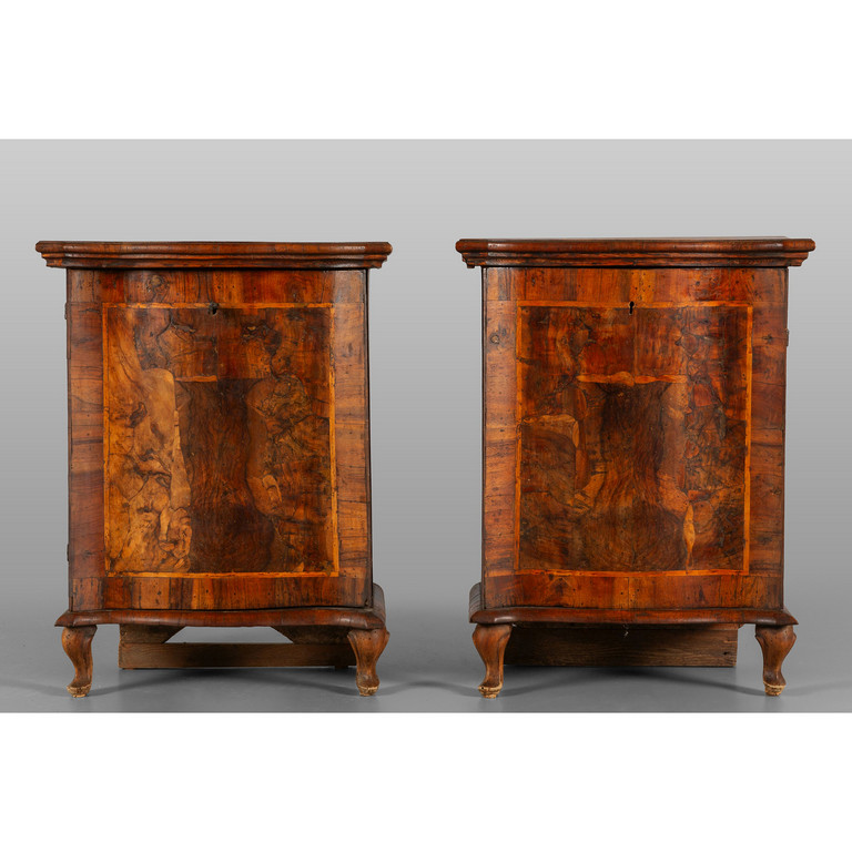 Coppia di mobiletti Luigi XIV ad uno sportello lastronati in radica e filettati in bois de rose Lombardia I metà sec.XVIII