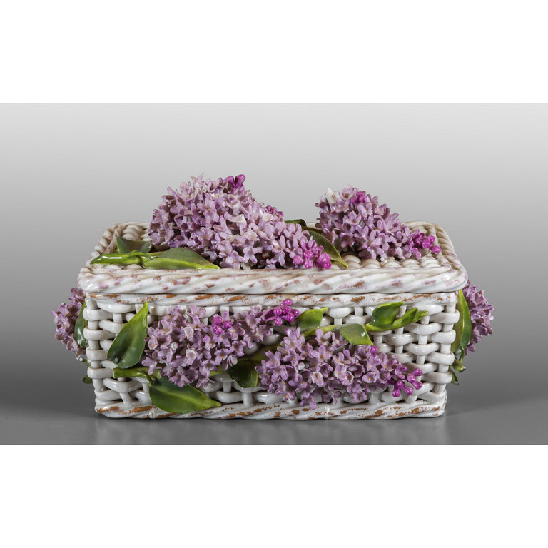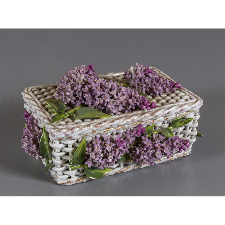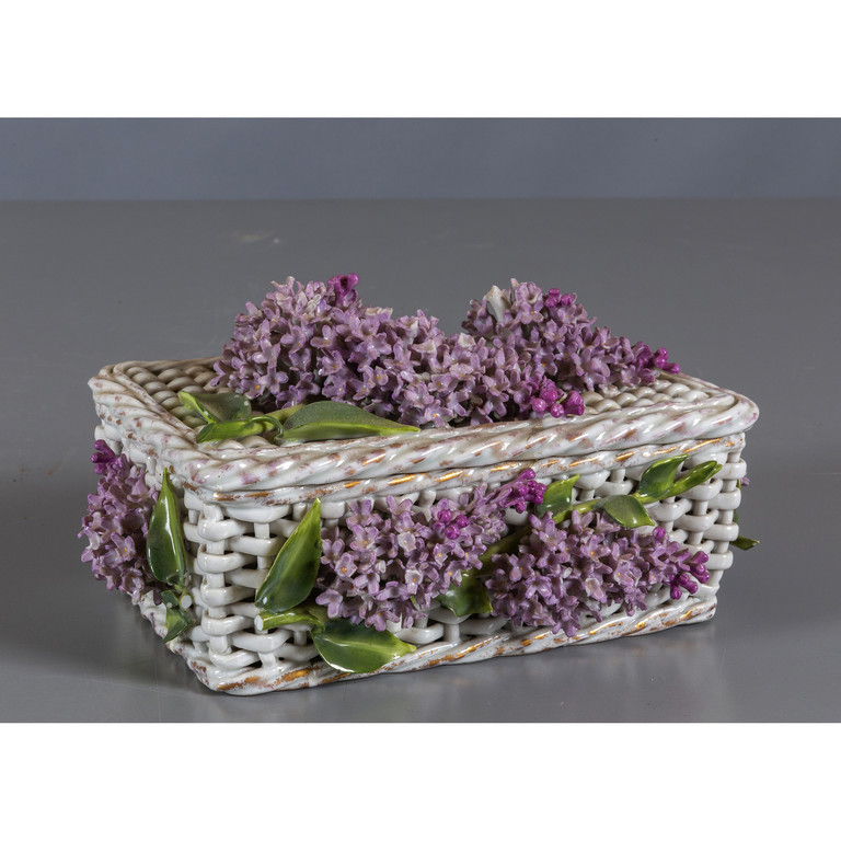 Cestino traforata in porcellana di Meissen con fiori di lillà in rilievo