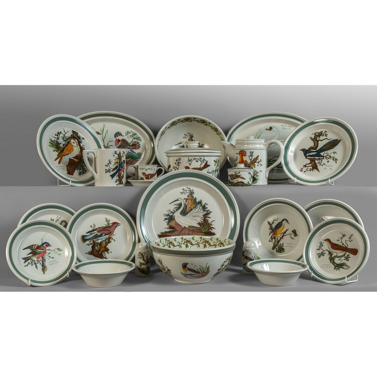 Servizio di piatti Portmeirion 'Birds of Britain' composto da: 12 piatti grandi 12 medi 12 piccoli e 12 fondi 3 piatti da portata ovali e 1 rotondo sale e pepe 2 coppe 1 biscottiera 12 coppette e servizio da thè composto da theiera lattiera zuccheriera brocca e 12 tazze con piattino