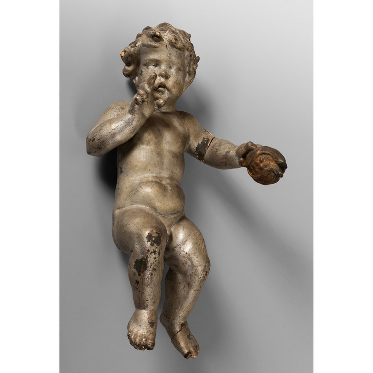 Putto con melograno scultura in legno intagliato e policromato Genova sec.XVII