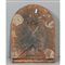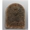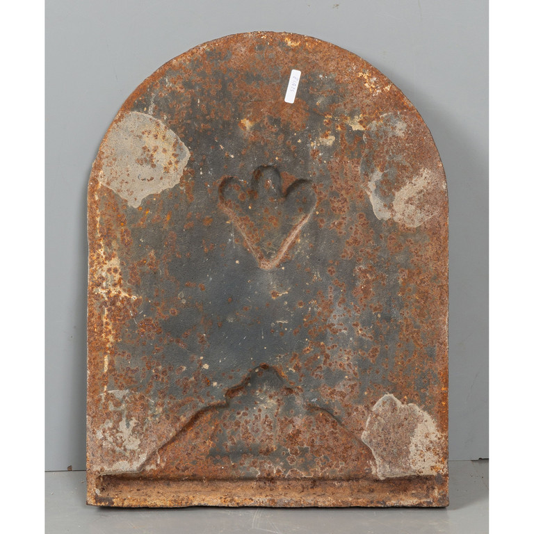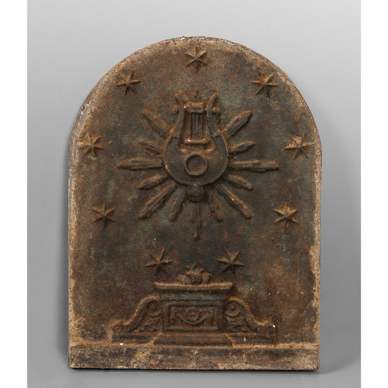Piastra da camino in ghisa decorata con scena massonica (cm.32x48) e spazzola da camino