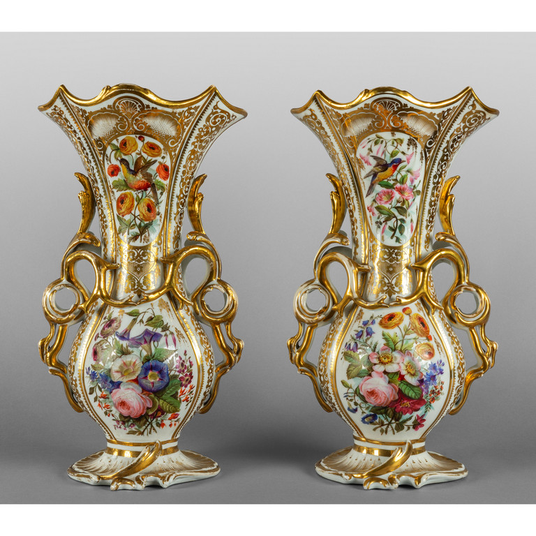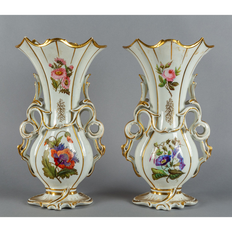 Coppia di vasi Luigi Filippo decorati in policromia a fiori su fondo bianco con profili dorati Francia sec.XIX