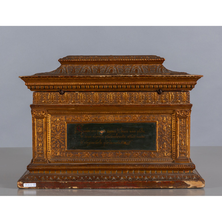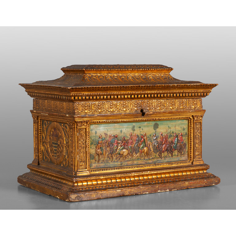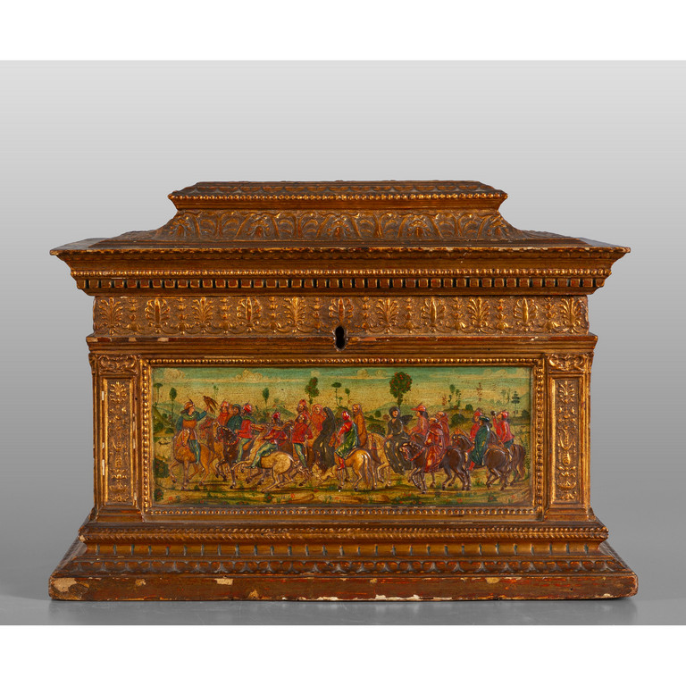 Scrigno in stile rinascimentale in legno intagliato e dorato sul fronte scena con cavalieri Toscana sec.XIX