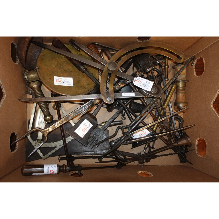 Scatola magica contenente 33 utensili antichi in ferro e bronzo