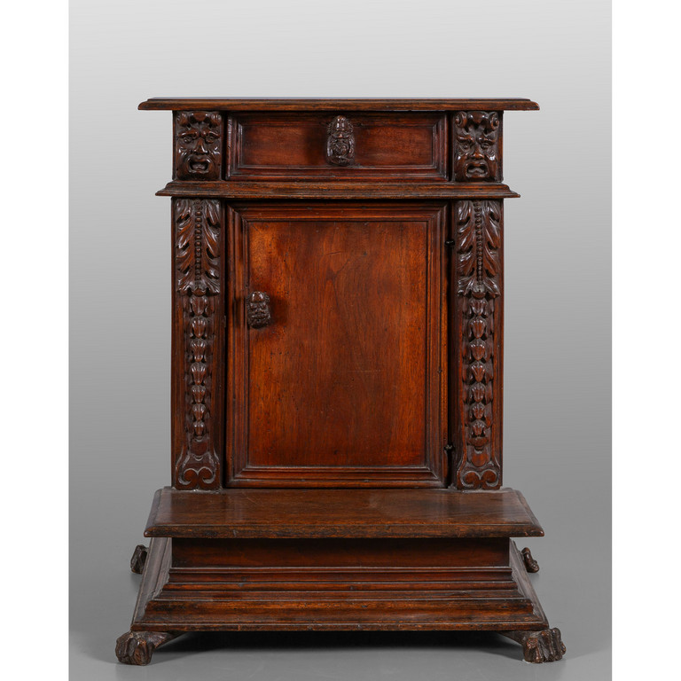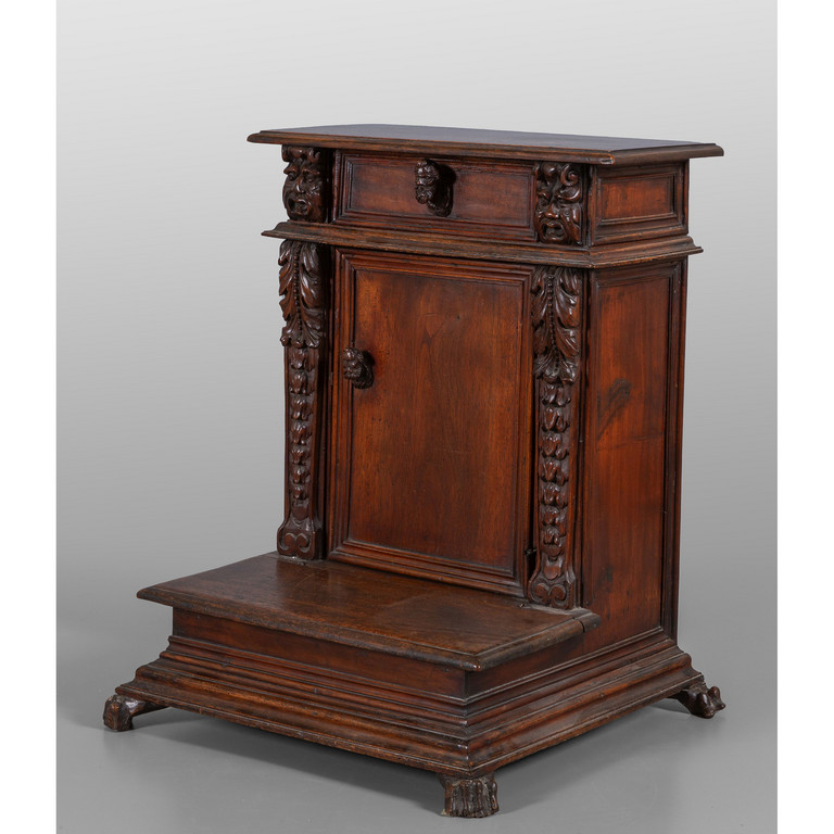 Inginocchiatoio in noce finemente intagliato a bambocci sec.XVII