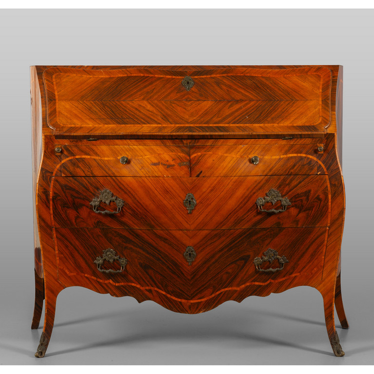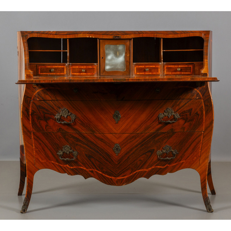 Ribalta in stile Luigi XV a due cassetti più due lastronata in palissandro e filettata in bois de rose Genova I metà sec.XX
