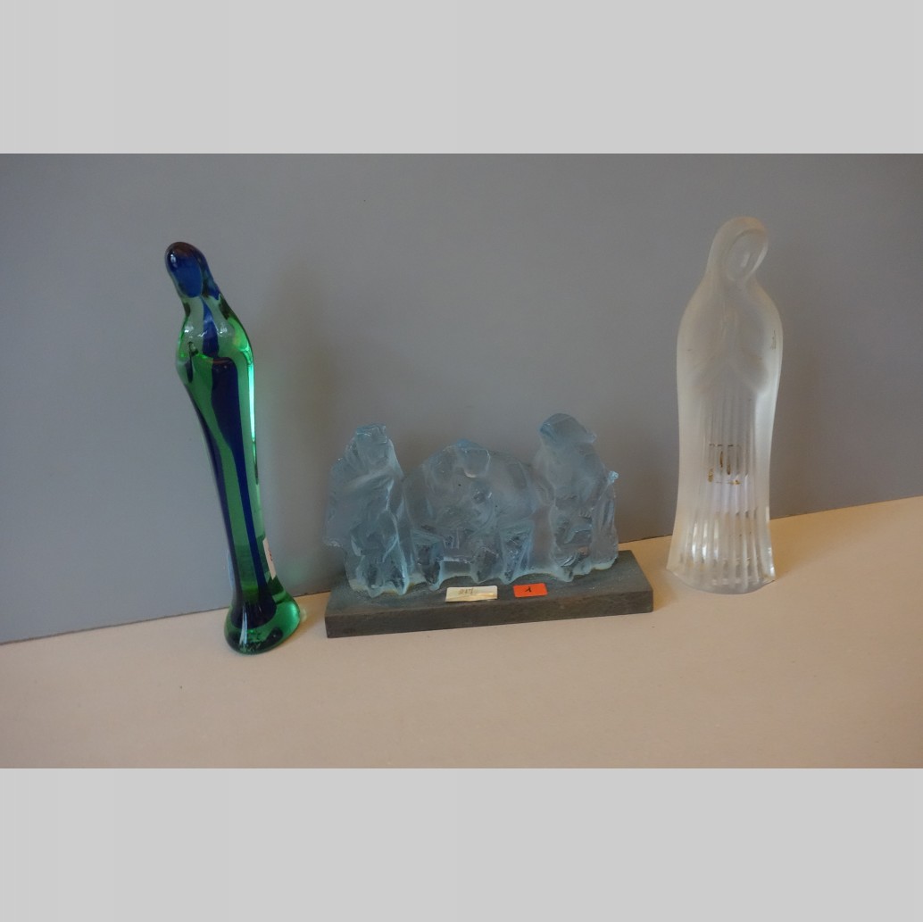 Due Madonnine di cui una in cristallo ed una in vetro con aureola rotta e gruppo in vetro celeste raffigurante Sacra Famiglia contornata da figure con base in argento f.ta Chiappe