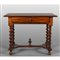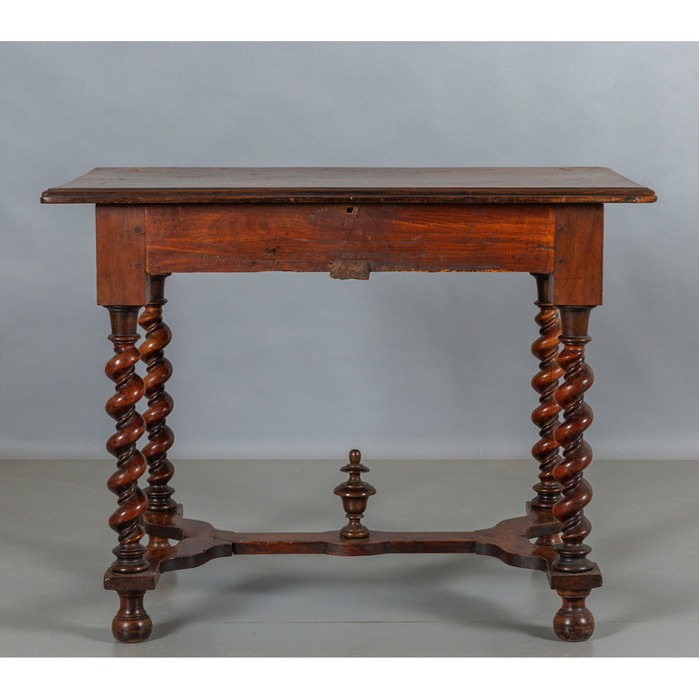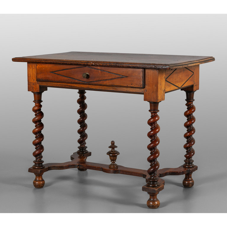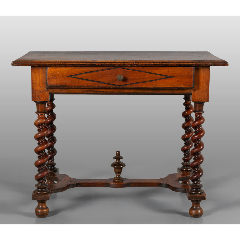 Tavolo a rocchetto in noce quattro gambe a tortiglione unite da traversa cassetto nella fascia Piemonte inizi sec.XVIII