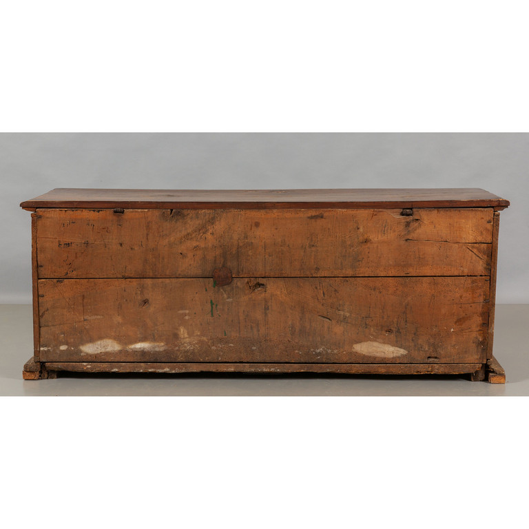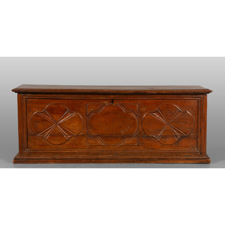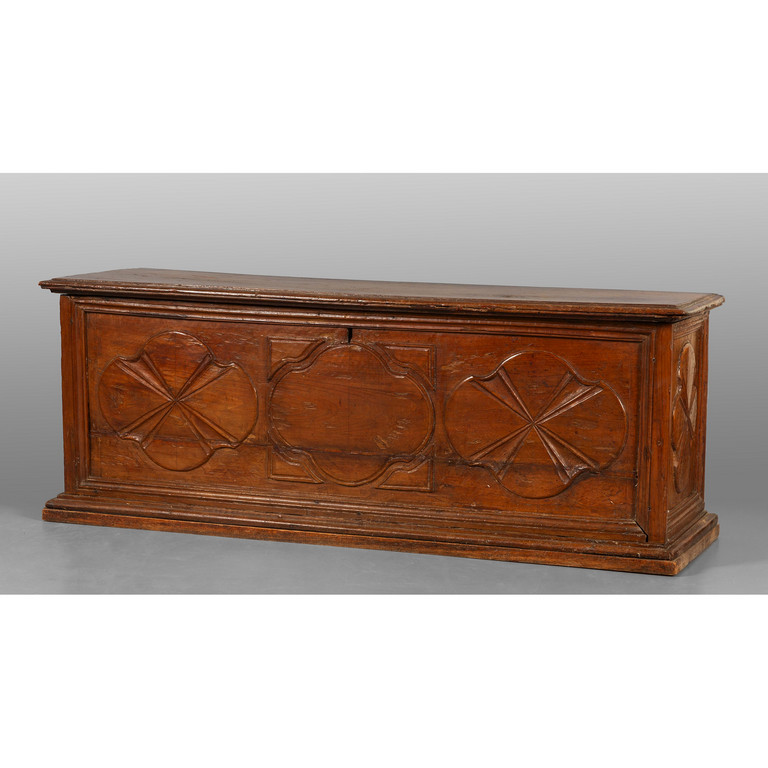Cassapanca Luigi XIV in noce con fronte intagliato a motivo di formelle Genova sec.XVII