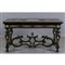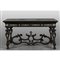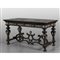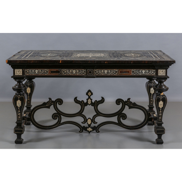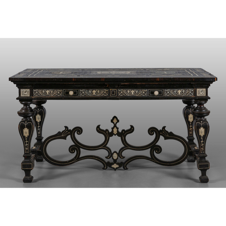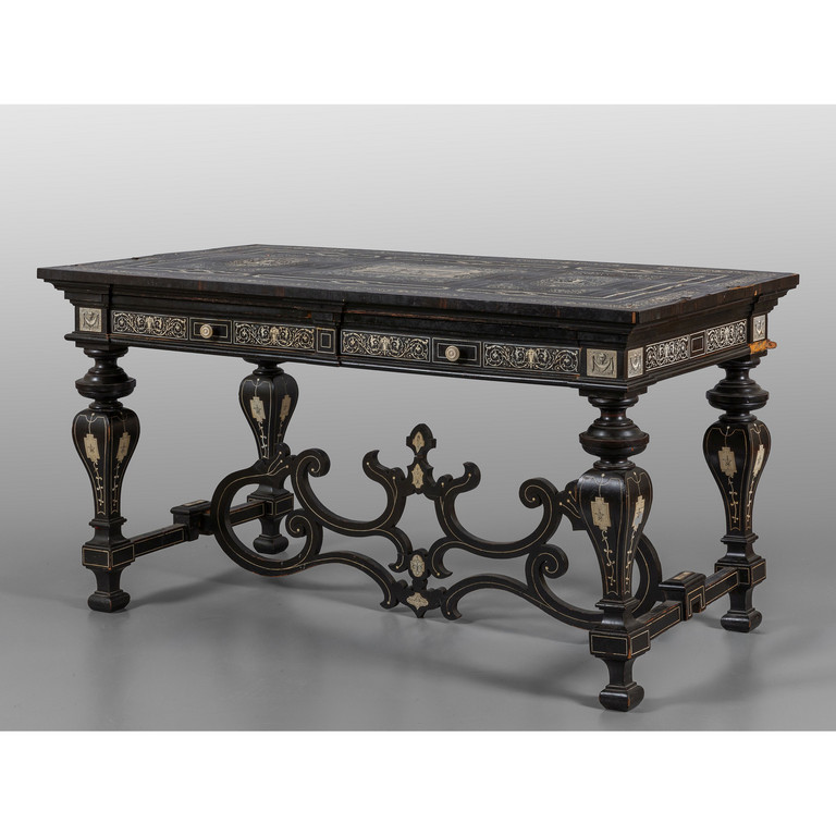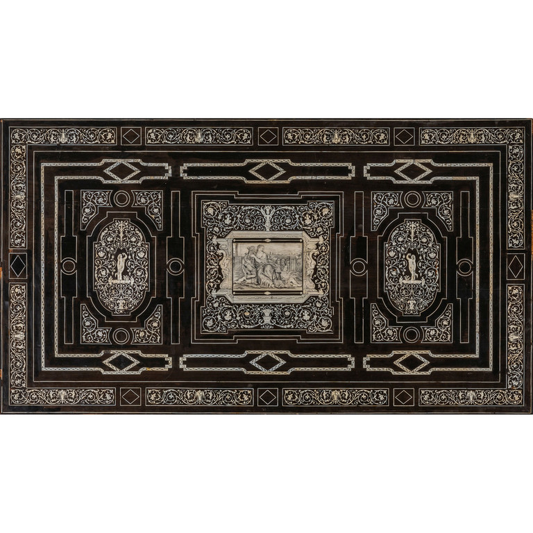 Tavolo da libreria neorinascimentale lastronato in ebano con ricca decorazione di intarsio in avorio pirografato a motivi neloclassici Milano fine sec.XIX