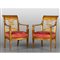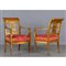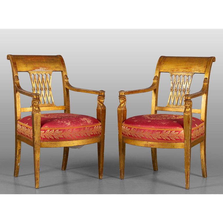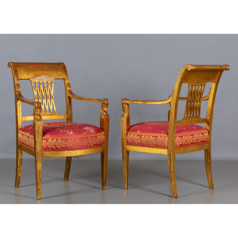 Coppia di poltrone noeclassiche in legno intagliato e dorato braccioli con figure egizie Toscana sec.XIX