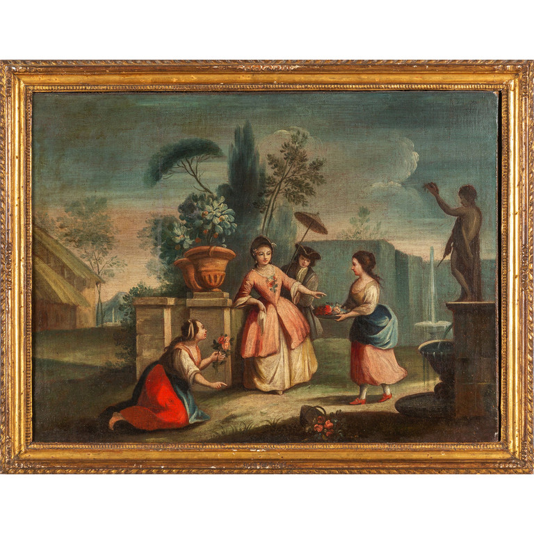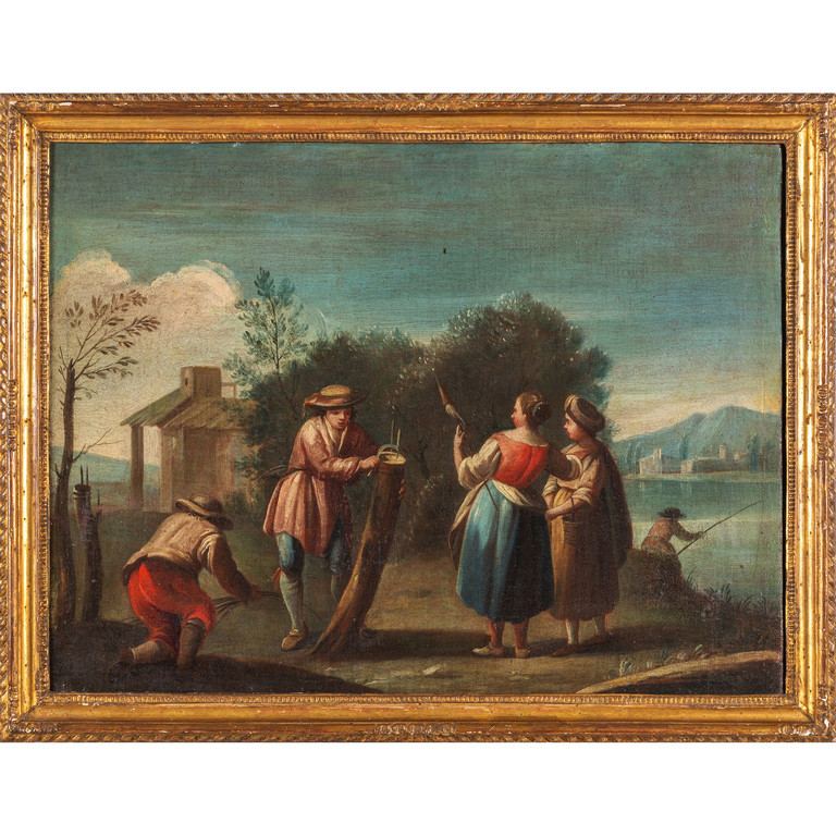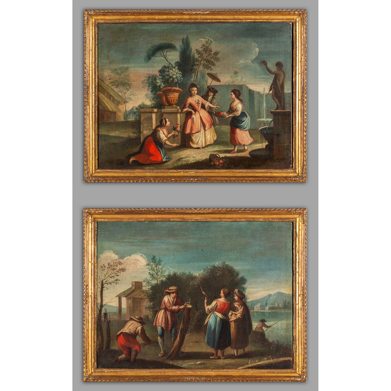 'Scene di genere' coppia di olii sec.XVIII cornici coeve in legno intagliato e dorato