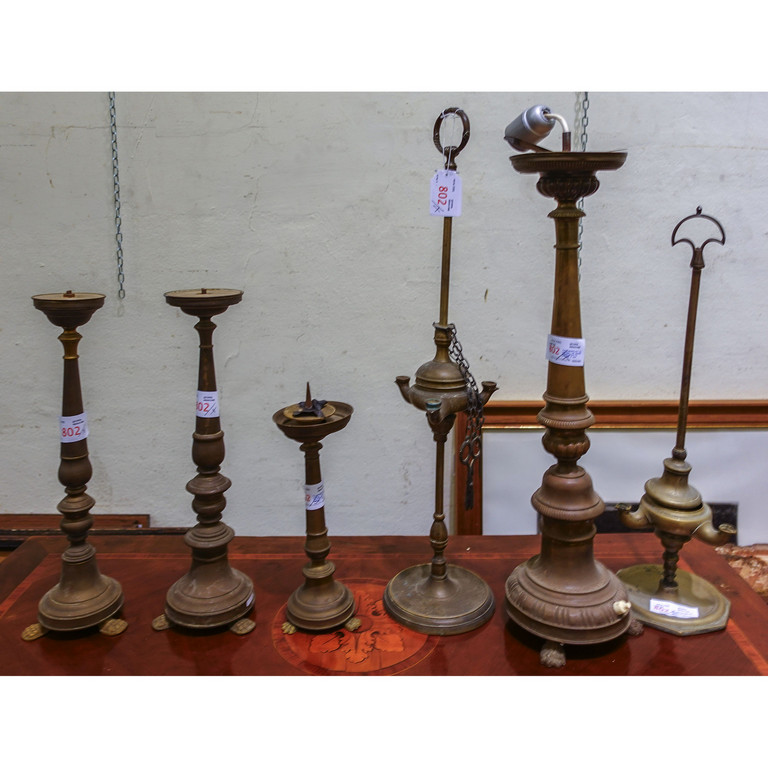 Tre candelieri in ottone un grande candeliere in ottone e due lucerne fiorentine