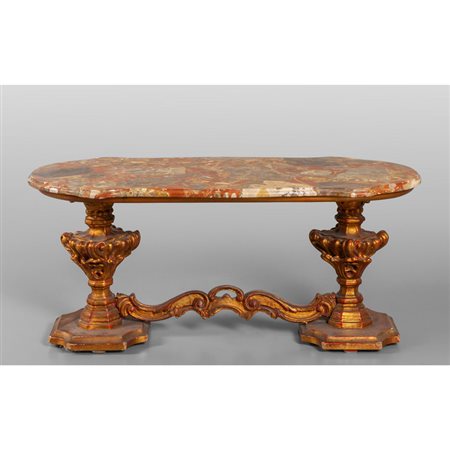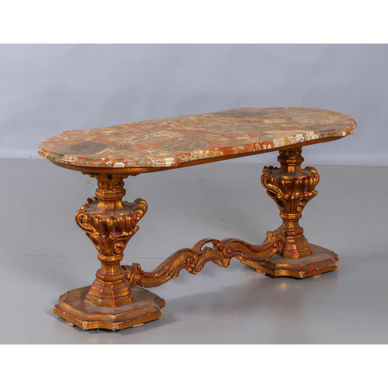 Tavolino da sofà formato da due vasi in legno dorato che sostengono un piano in marmo sec.XX