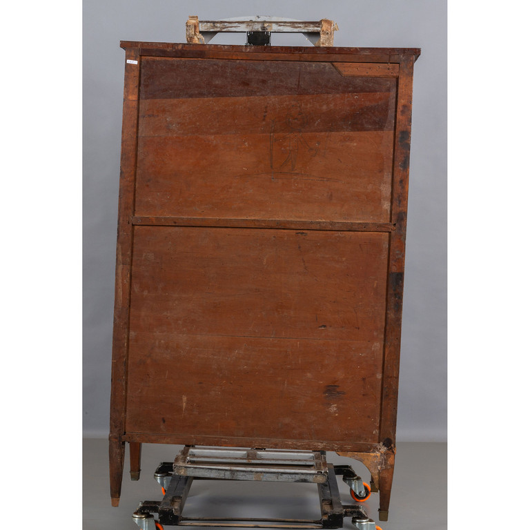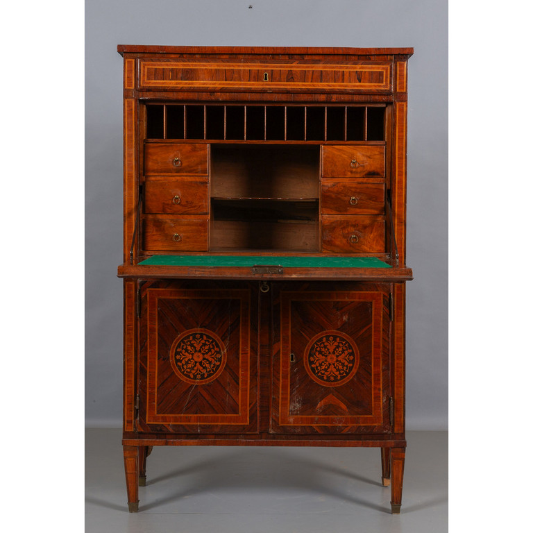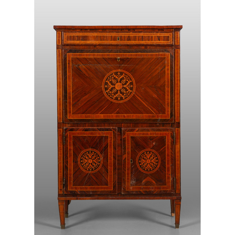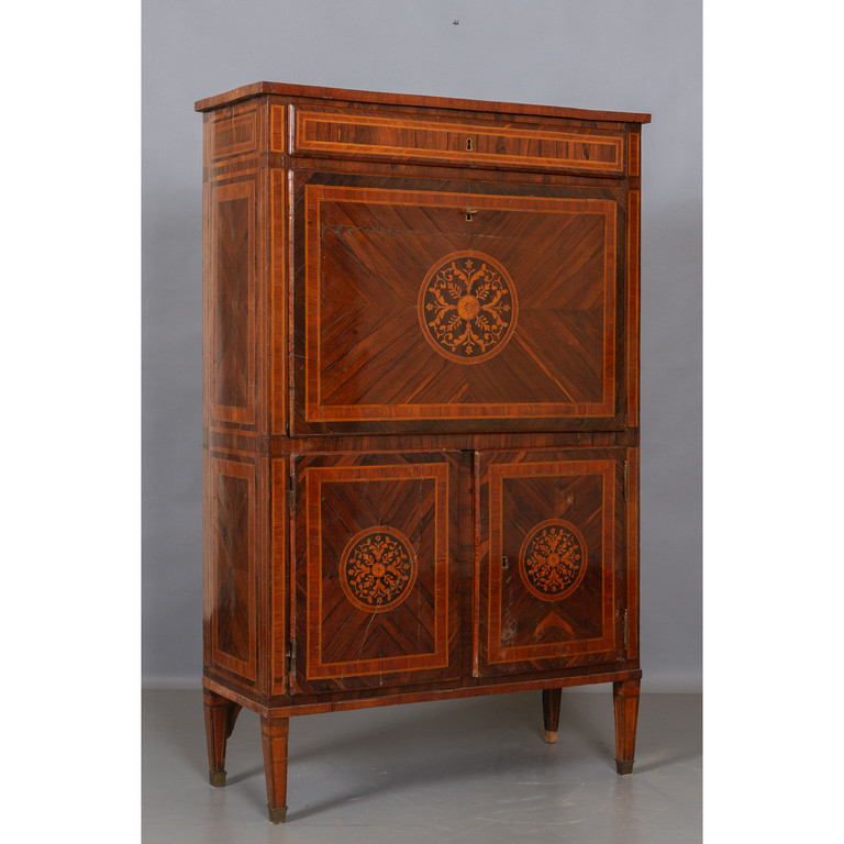 Secretaire Luigi XVI a due sportelli più calatoia e cassetto lastronato in palissandro e filettato in legno di rosa Lombardia sec.XVIII