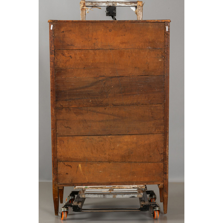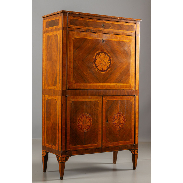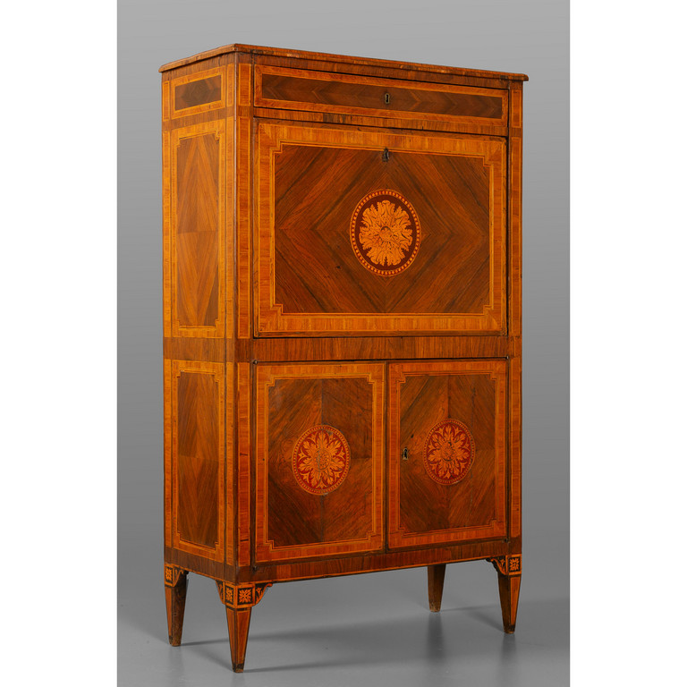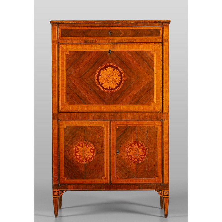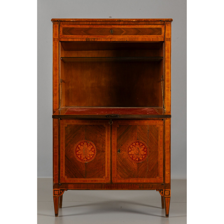 Secretaire Luigi XVI lastronato in noce e intarsiato in bois de rose calatoia intarsiata con rosone centrale riportato anche sugli sportelli piano lastronato II metà Lombardia fine sec.XVIII