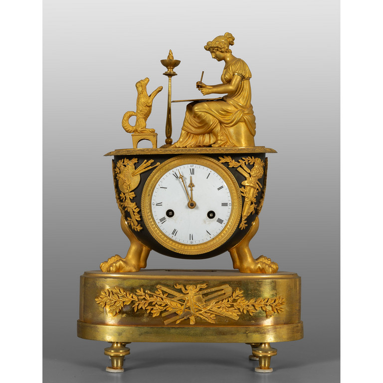Orologio Impero in bronzo dorato e brunito raffigurante scrittrice inizi sec.XIX