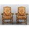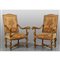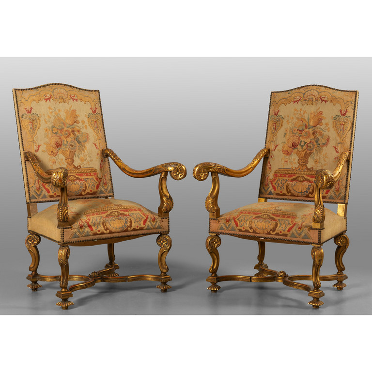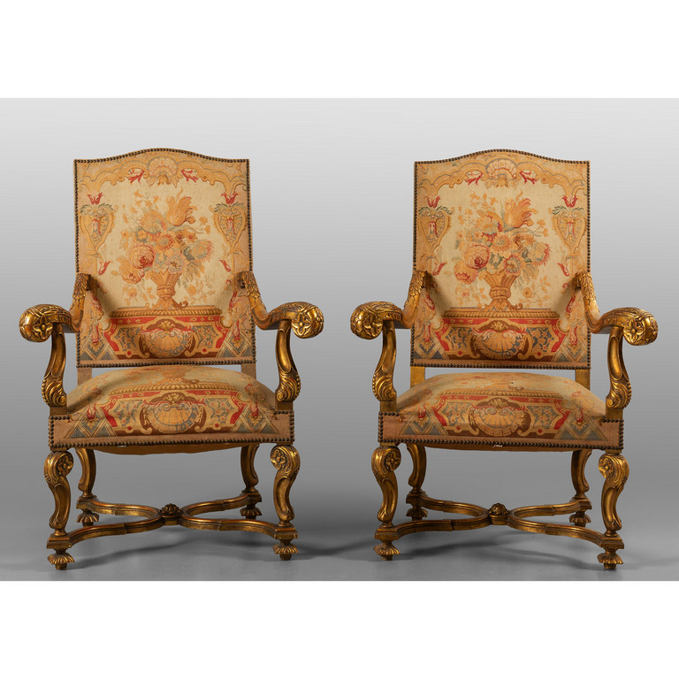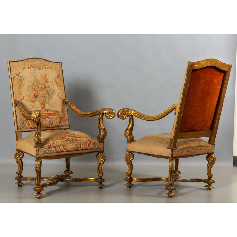 Coppia di poltrone dorate in stile Luigi XIV gambe raccordate da crociera imbottitura a piccolo punto
