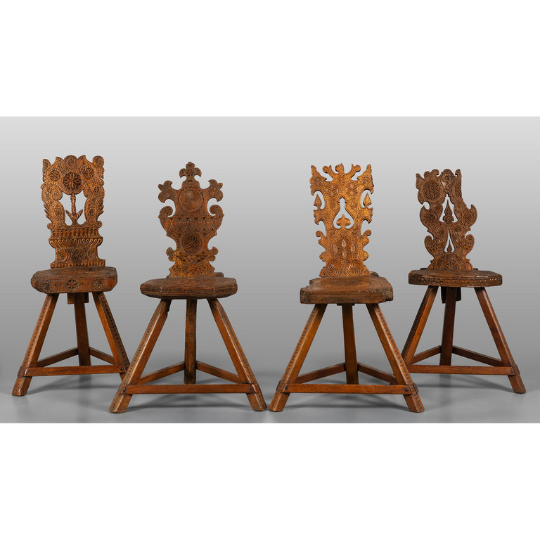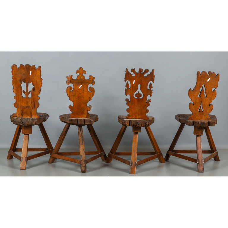 Quattro sgabelli in noce con schienali intagliati Alto-Veneto sec.XVII