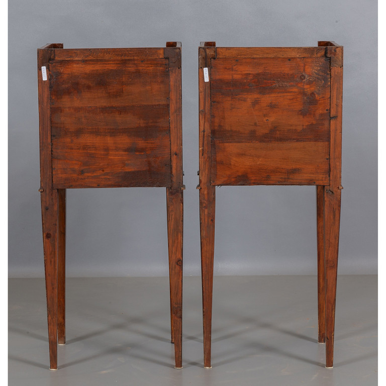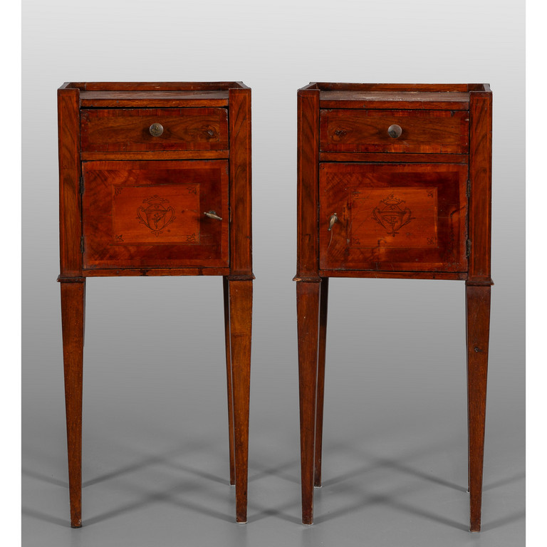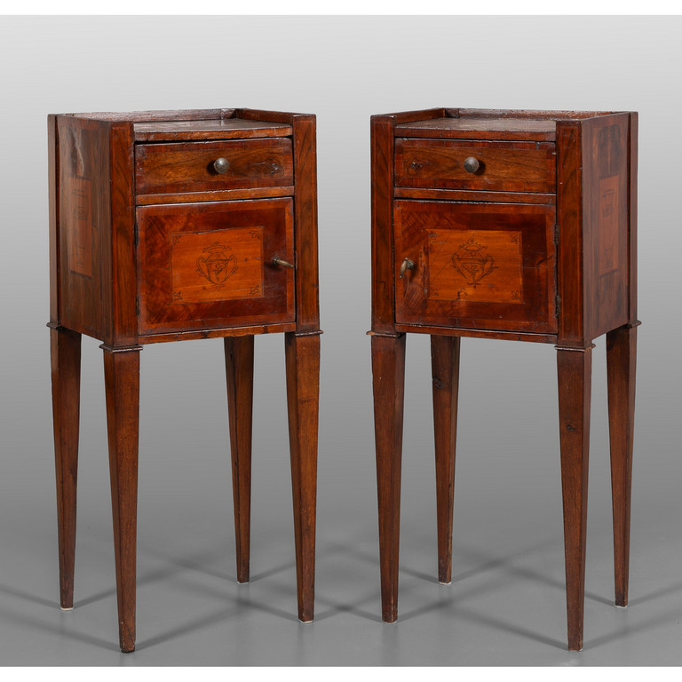 Coppia di comodini direttorio ad uno sportello con cassettino lastronati ed intarsiati Nord Italia sec.XIX