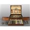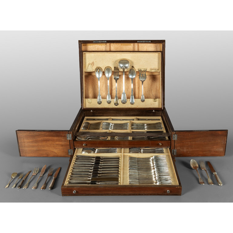 Servizio di posate in argento per 12 nella sua scatola composto da: 24 forchette grandi 18 forchette piccole 24 coltelli grandi e 12 piccoli 12 cucchiai da minestra 12 cucchiaini da gelato 12 forchette da pesce con 12 coltelli 12 forchettine 12 cucchiaini cifrati 6 forchettine da ostriche 1 mestolo e 5 posate da portata (mancano due posate da portata)