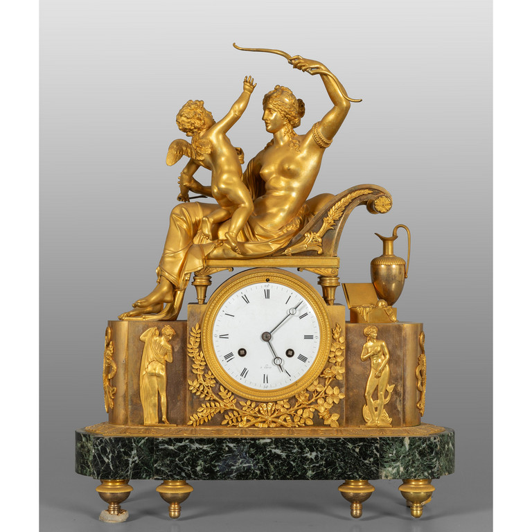 Orologio in bronzo dorato raffigurante Venere che toglie l'arco ad Amore Francia inizi sec.XIX