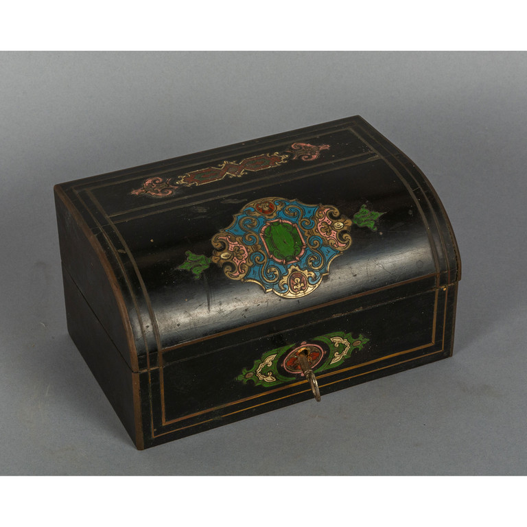 Scatola portaprofumi in legno intarsiato in rame e smalti sec.XIX