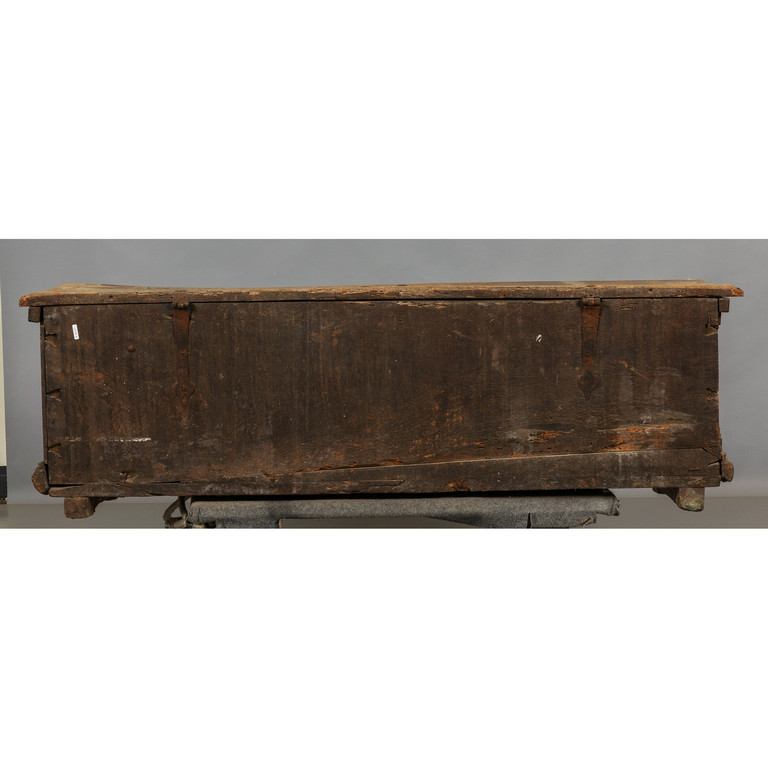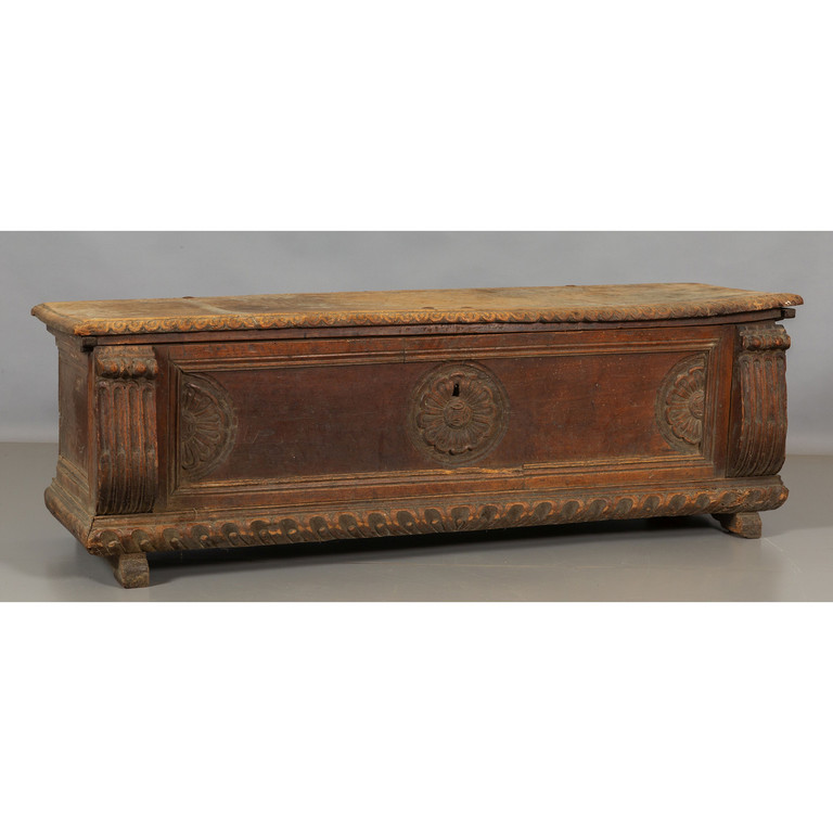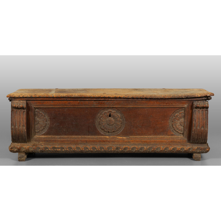 Cassapanca Luigi XIV in noce scolpita con rosone centrale e lesene laterali sec.XVII