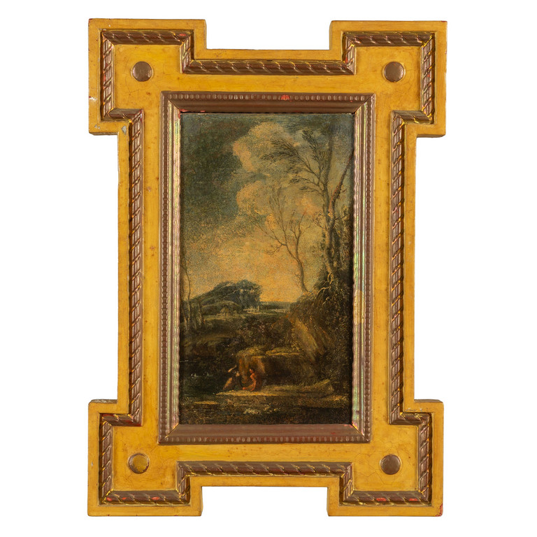 Scuola italiana sec.XVIII 'Figurine in un paesaggio' olio cornice laccata a fondo bianco