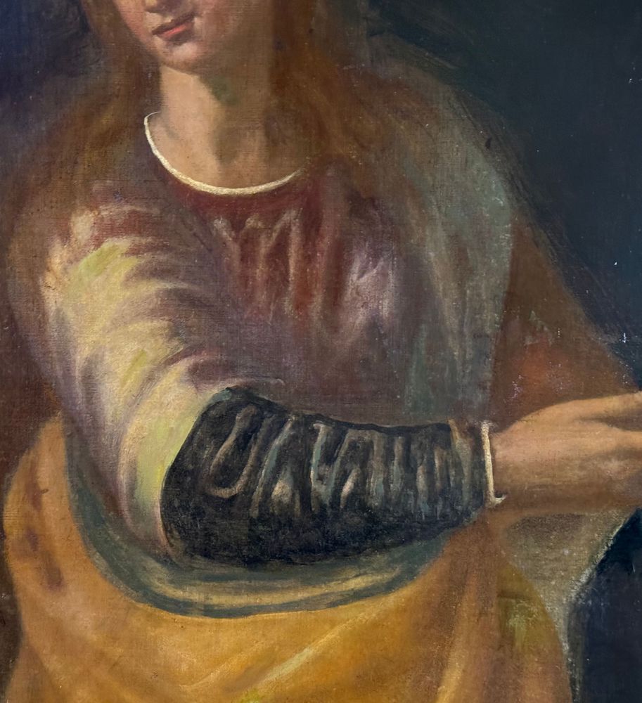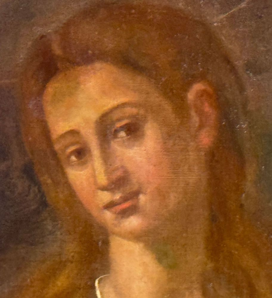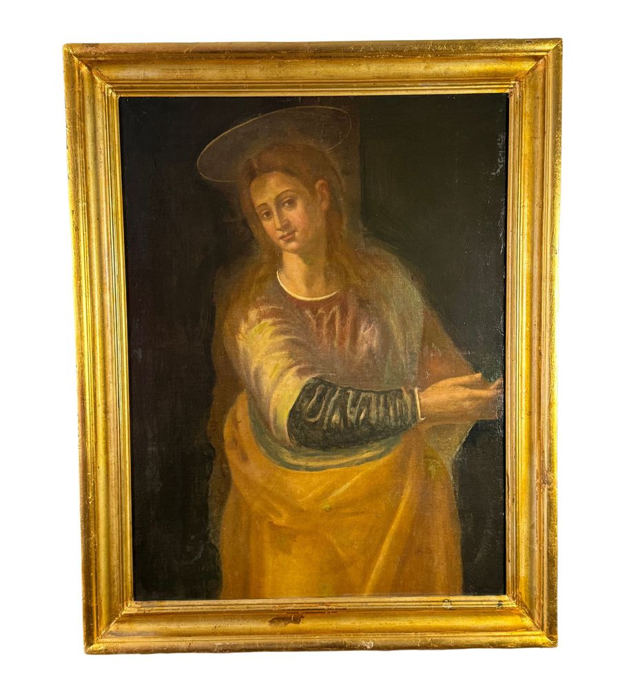 Dipinto olio su tela, periodo XVIII secolo scuola Italiana, raffigurante Vergine. Dimensioni compreso cornice: 80x102 cm. Dimensioni interno cornice: 65x87 cm. Da artista anonimo. Opera pittorica integra da segnalare un antico rintelo e sparsi punti di restauro.