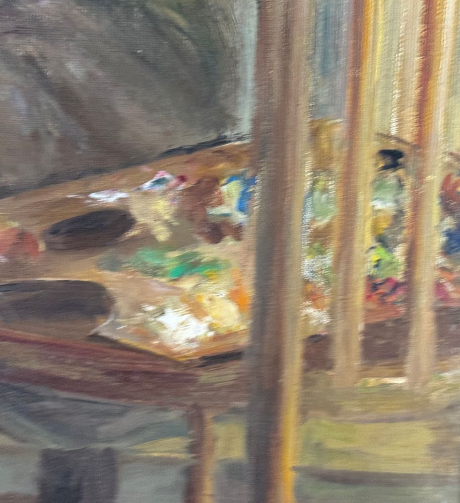 Dipinto olio su tela, periodo XIX/XX secolo scuola Italiana, raffigurante Lo studio del pittore. Dimensioni compreso cornice: 74x100 cm. Dimensioni interno cornice: 53x79 cm. Da artista anonimo. Opera in buone condizioni.