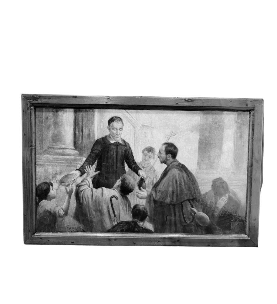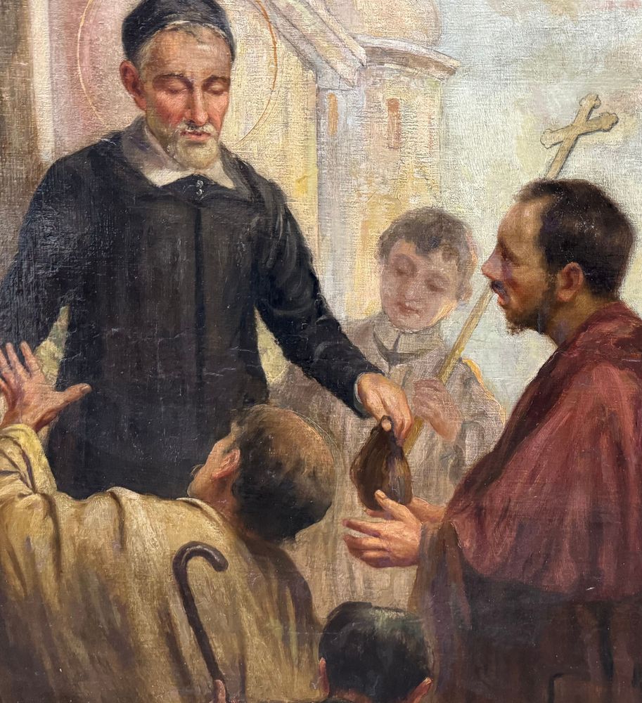 Dipinto olio su tela applicata su tavola, periodo inizio XX secolo scuola Italiana, raffigurante La predicazione di San Francesco di Sales, il santo dei poveri e degli afflitti. Dimensioni compreso cornice: 189x120 cm. Dimensioni interno cornice: 170x100 cm. Reca firma e data in basso a sinistra da Girosi 1919. Opera in discrete condizioni con sparsi punti di restauro.
