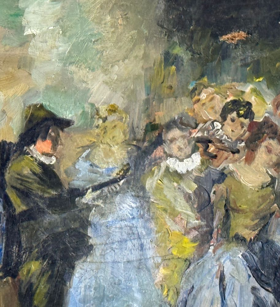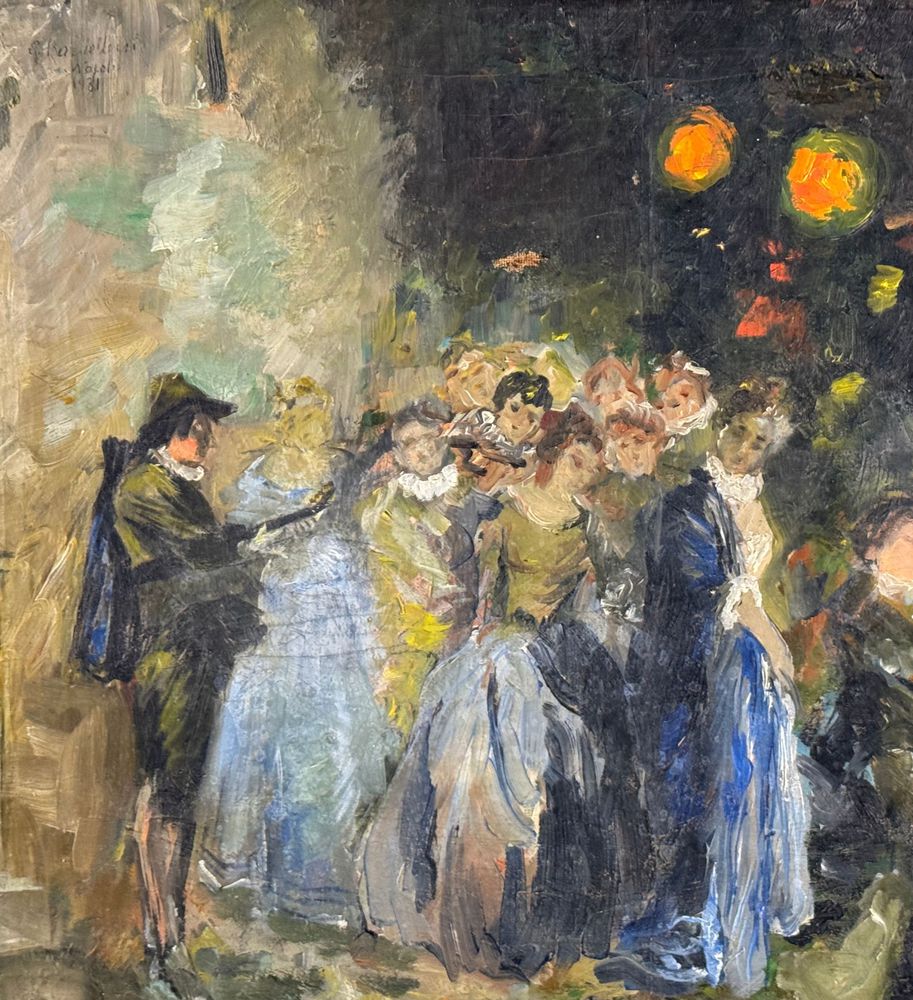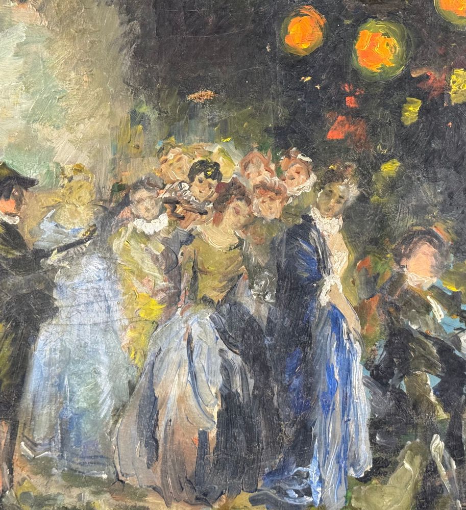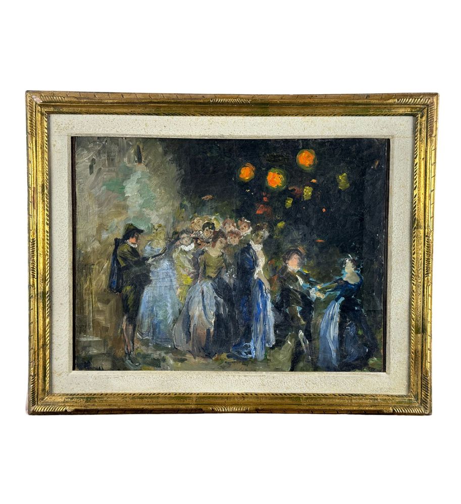 Dipinto olio su tela, periodo prima metà del XX secolo scuola Italiana, raffigurante Personaggi al ballo. Dimensioni compreso cornice: 61x48 cm. Dimensioni interno cornice: 36x46 cm. Da artista anonimo. Opera in buone condizioni con lievi segni di vissuto come da foto allegate.
