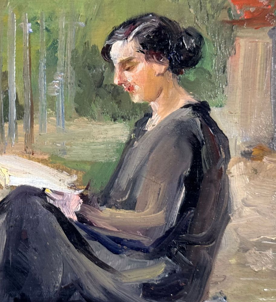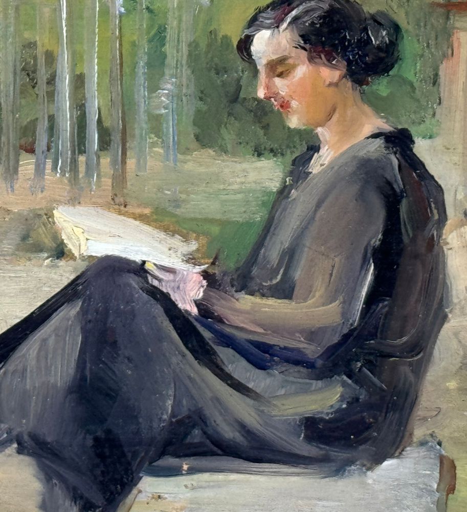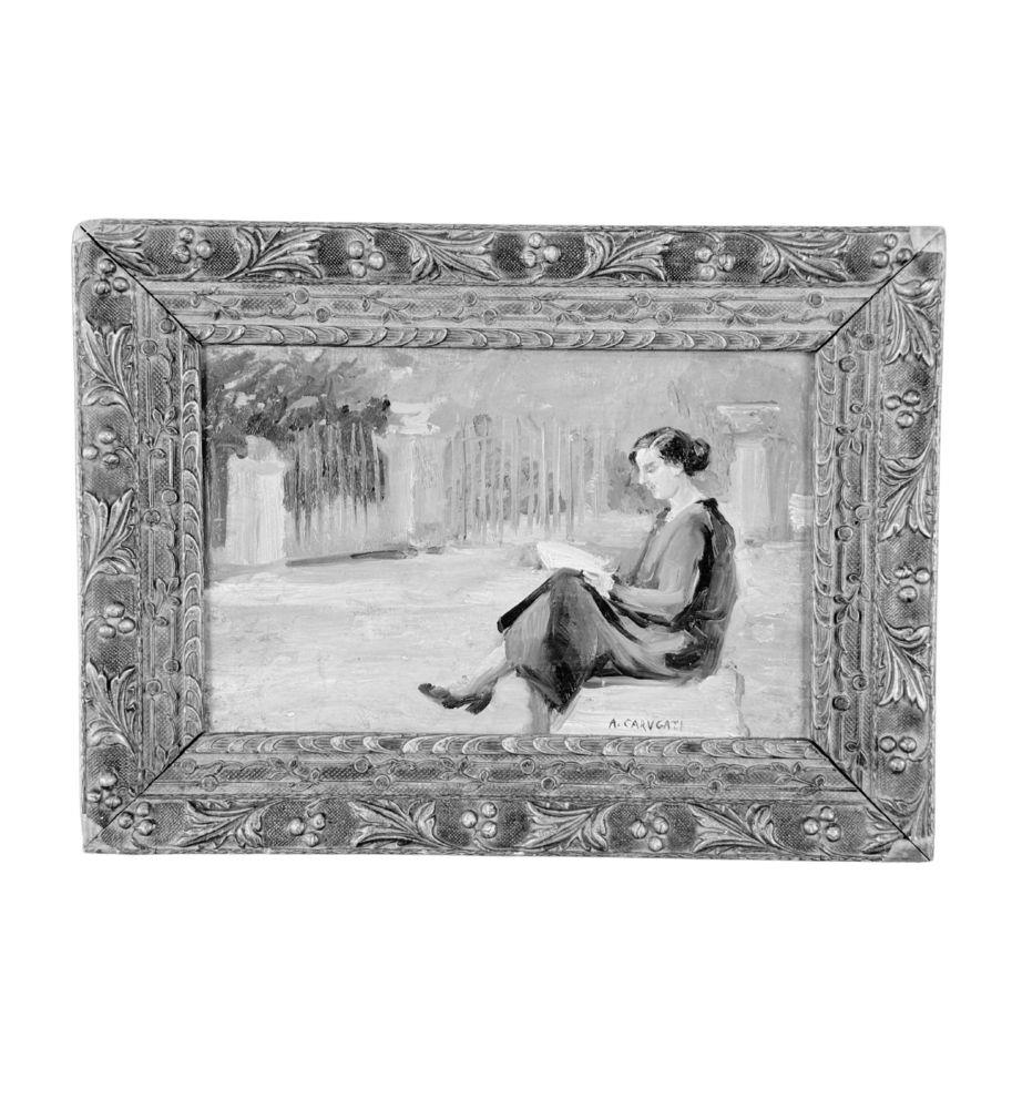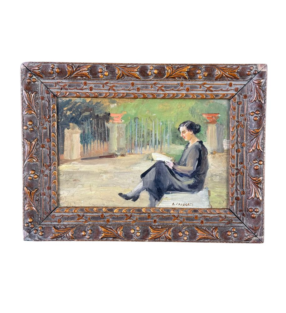Dipinto olio su tavola, periodo XX secolo scuola Italiana, raffigurante Donna in lettura al parco. Dimensioni compreso cornice: 37x27 cm. Dimensioni interno cornice: 27x18 cm. Reca firma in basso a destra da Angela Carugati. Opera in buone condizioni.