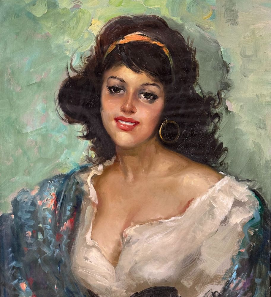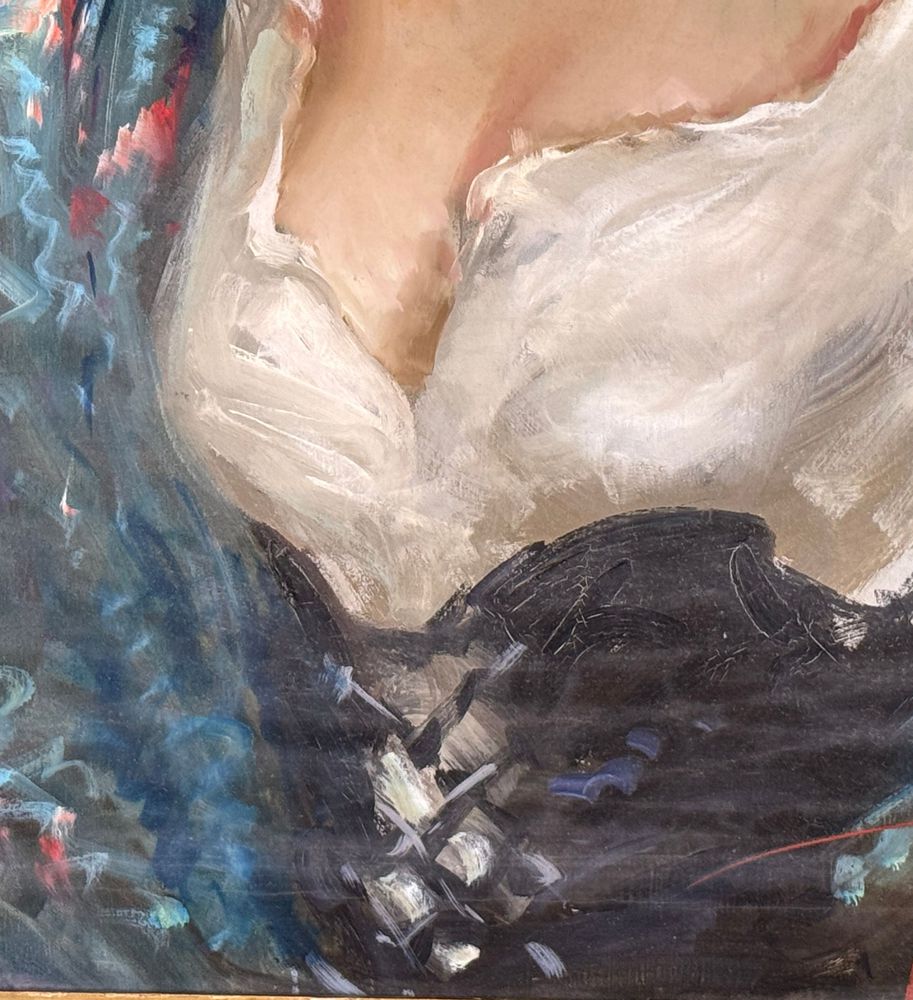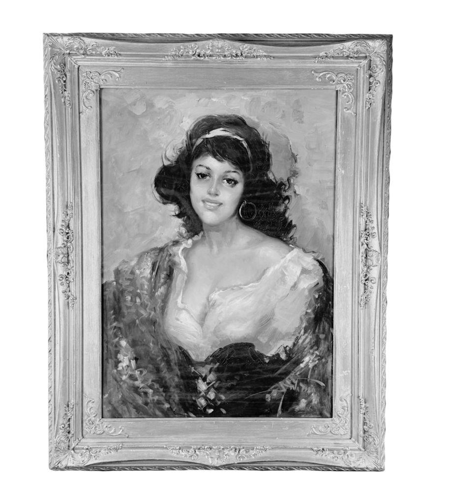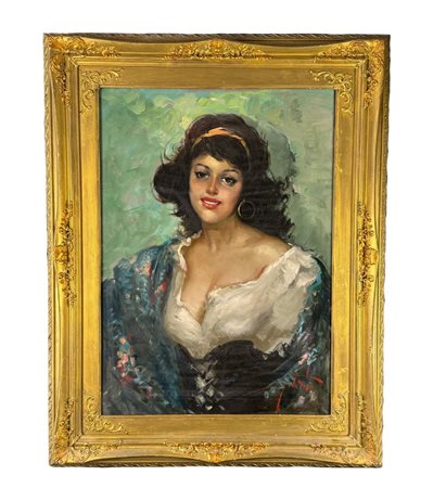 Dipinto olio su tela, periodo XX secolo scuola Italiana, raffigurante Ritratto di donna. Dimensioni compreso cornice: 72x92 cm. Dimensioni interno cornice: 50x70 cm. Reca firma in basso a destra da artista non identificato. Opera in buone condizioni.