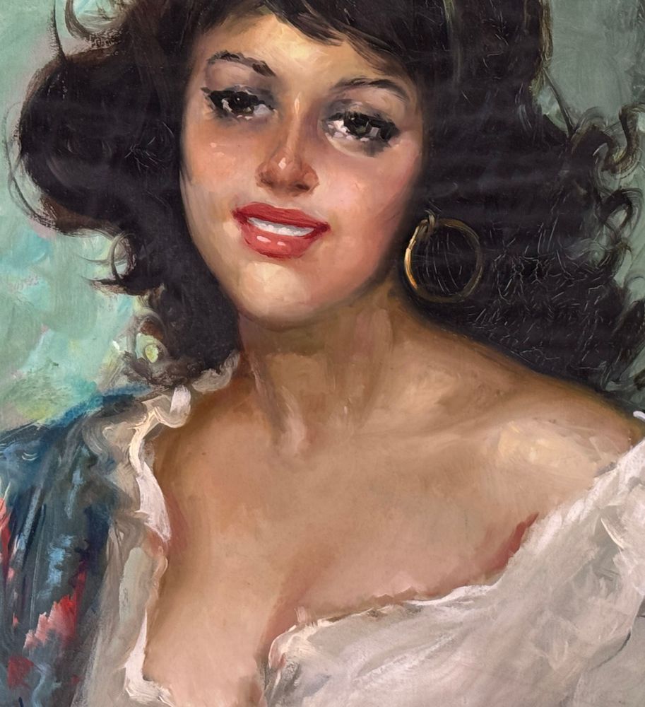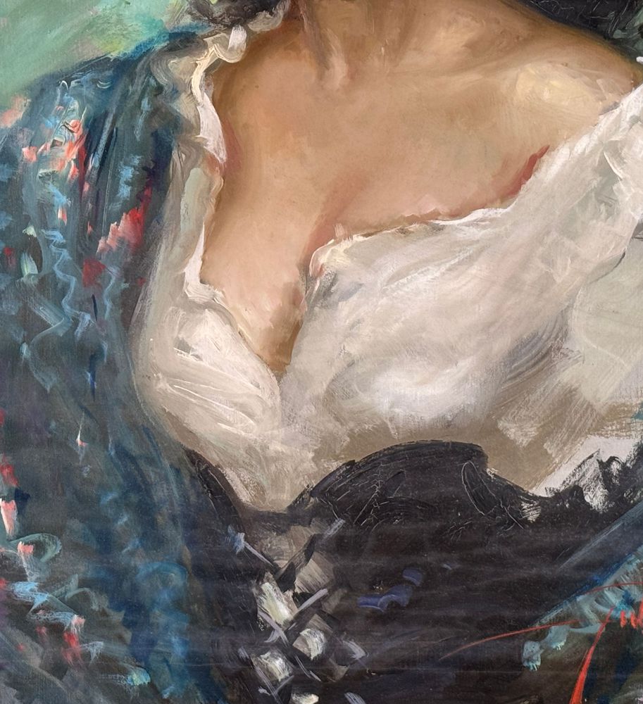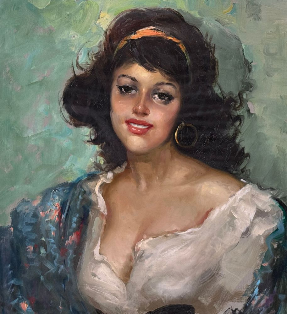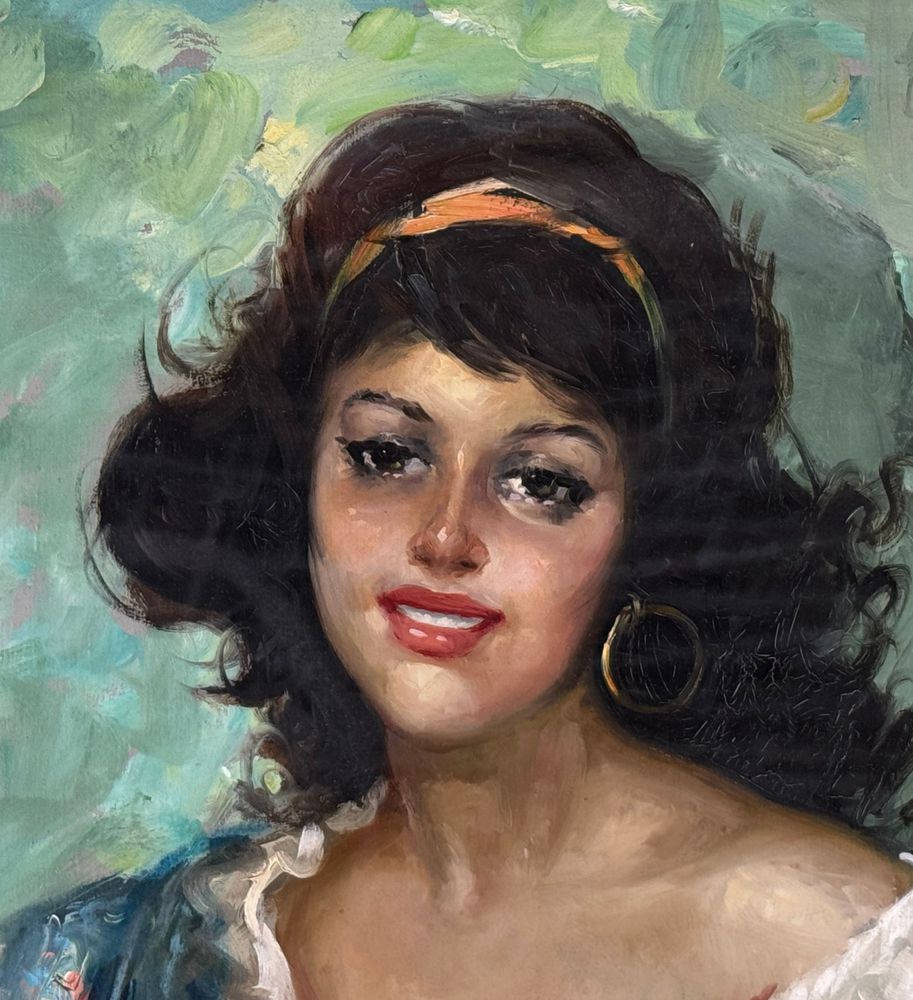 Dipinto olio su tela, periodo XX secolo scuola Italiana, raffigurante Ritratto di donna. Dimensioni compreso cornice: 72x92 cm. Dimensioni interno cornice: 50x70 cm. Reca firma in basso a destra da artista non identificato. Opera in buone condizioni.