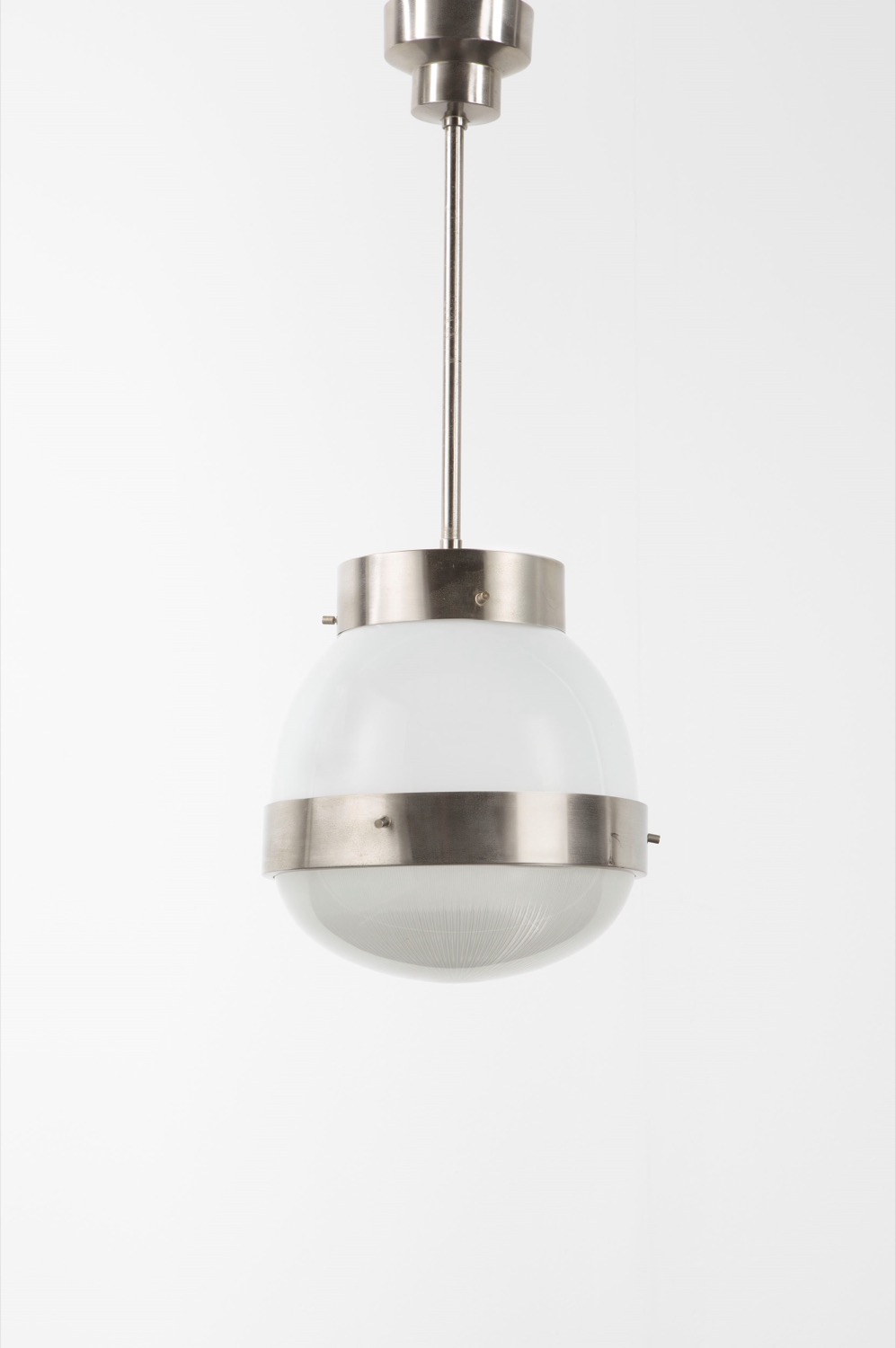 Produzione Artemide lampada da soffitto in ottone nichelato, diffusore in vetro opalino, coppa in cristallo stampato.