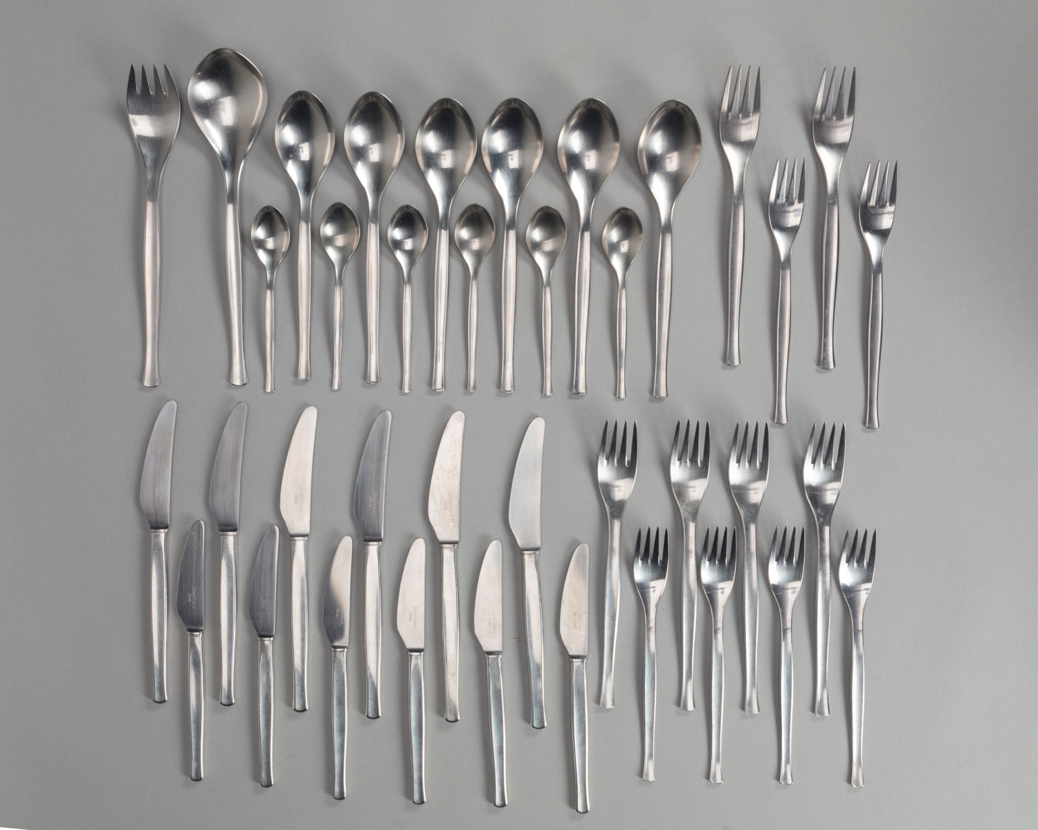 composto da sei coltelli da portata, sei coltelli da frutta, sei cucchiai, sei cucchiaini, sei forchette e sei forchettine, in metallo
