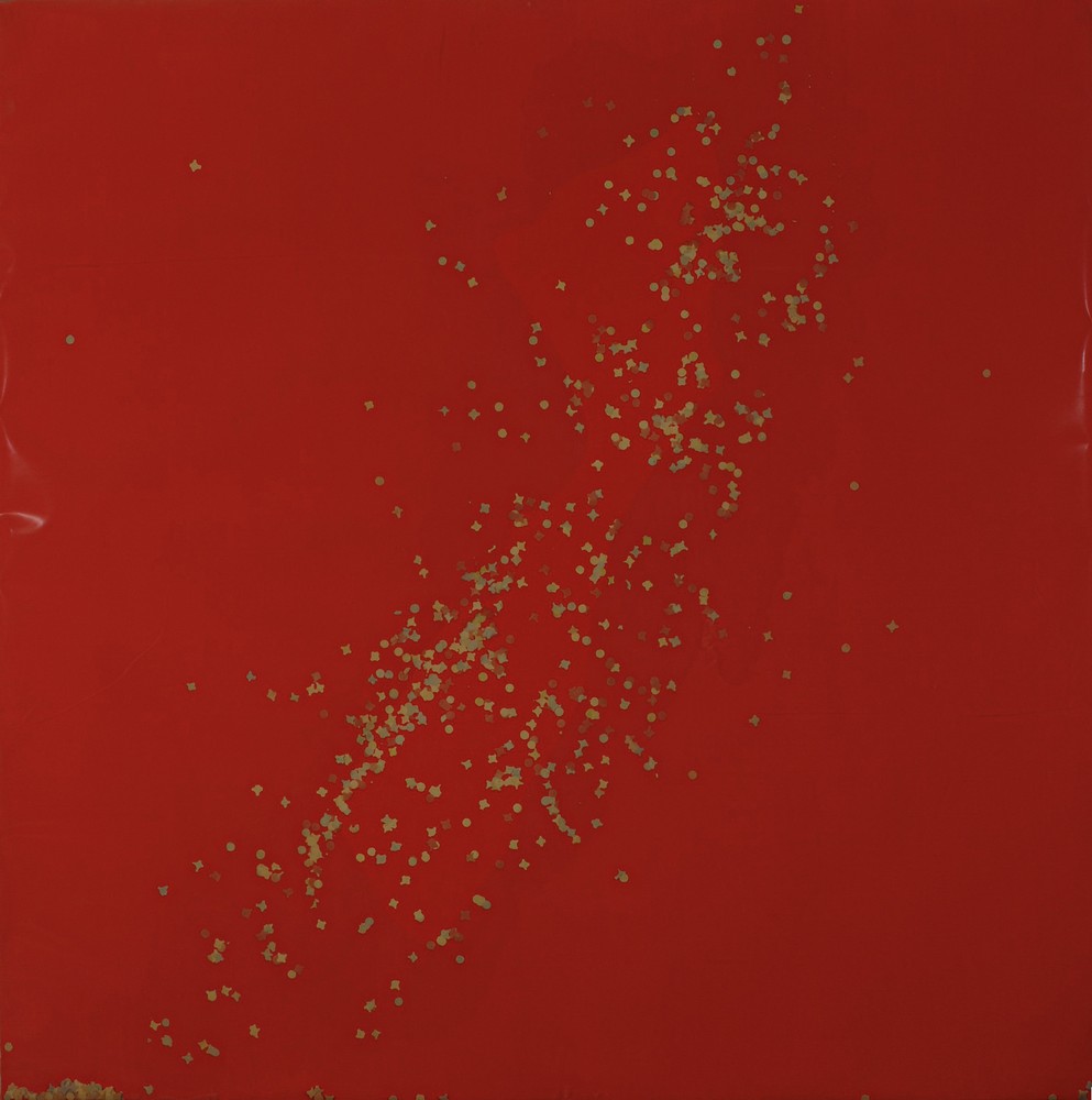 FESTA TANO (1938 - 1988) CORIANDOLI (ROSSO). 1986. Acrilico e coriandoli su tela . Cm 100,00 x 100,00. L'opera è accompagnata dal certificato di archiviazione dello Studio Soligo, Roma, a cura di Raffaella Soligo
