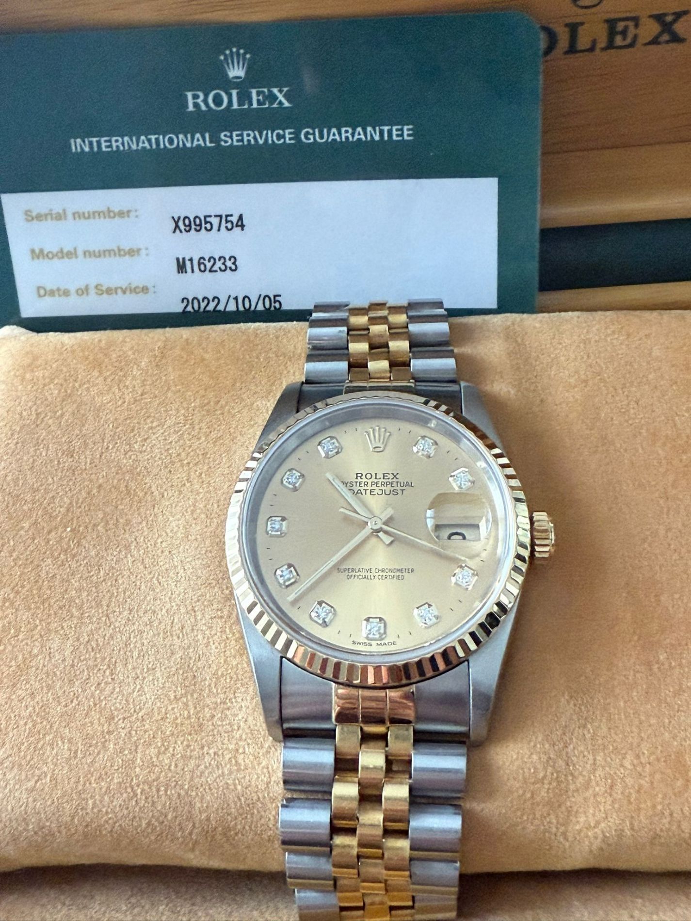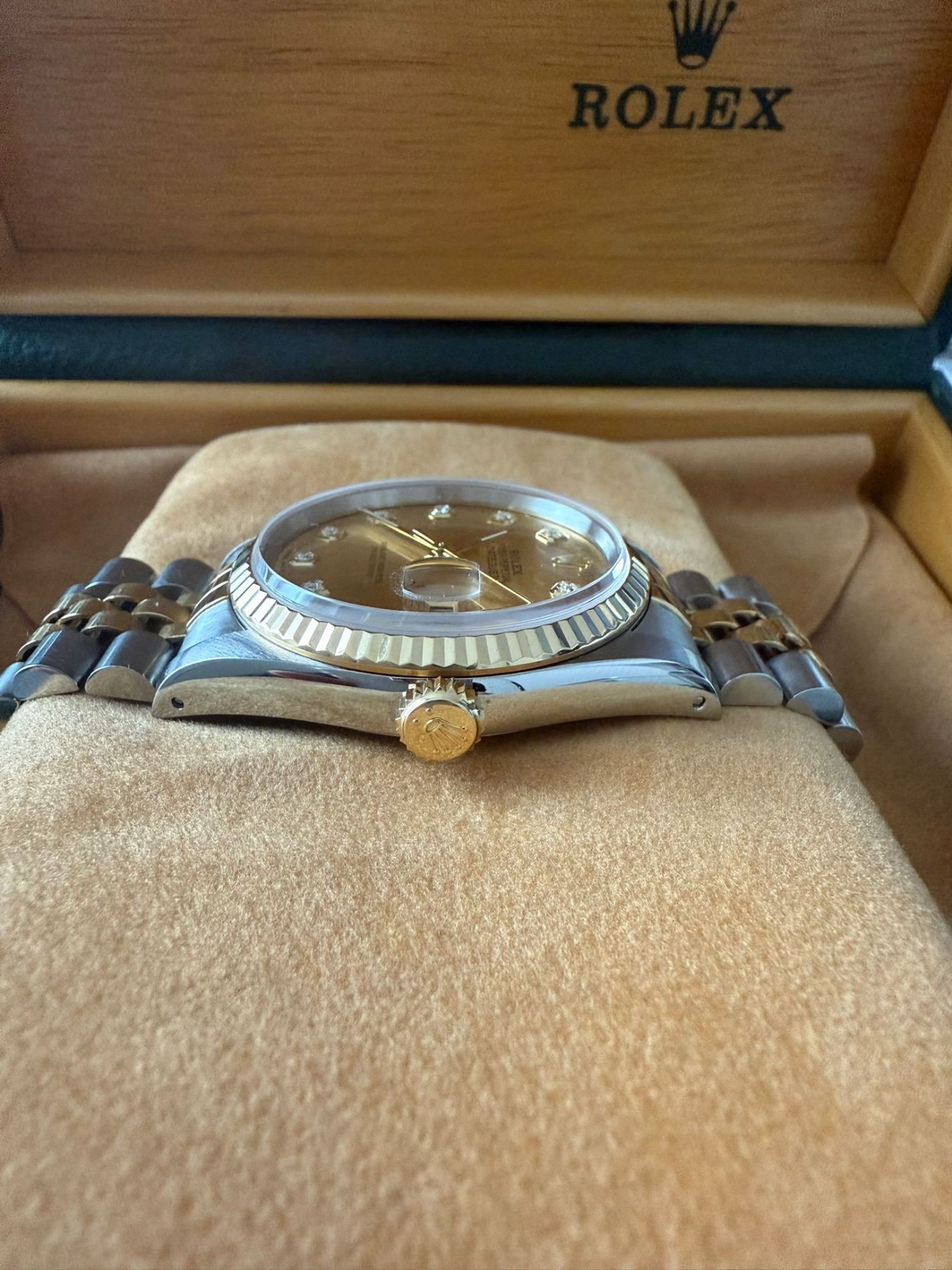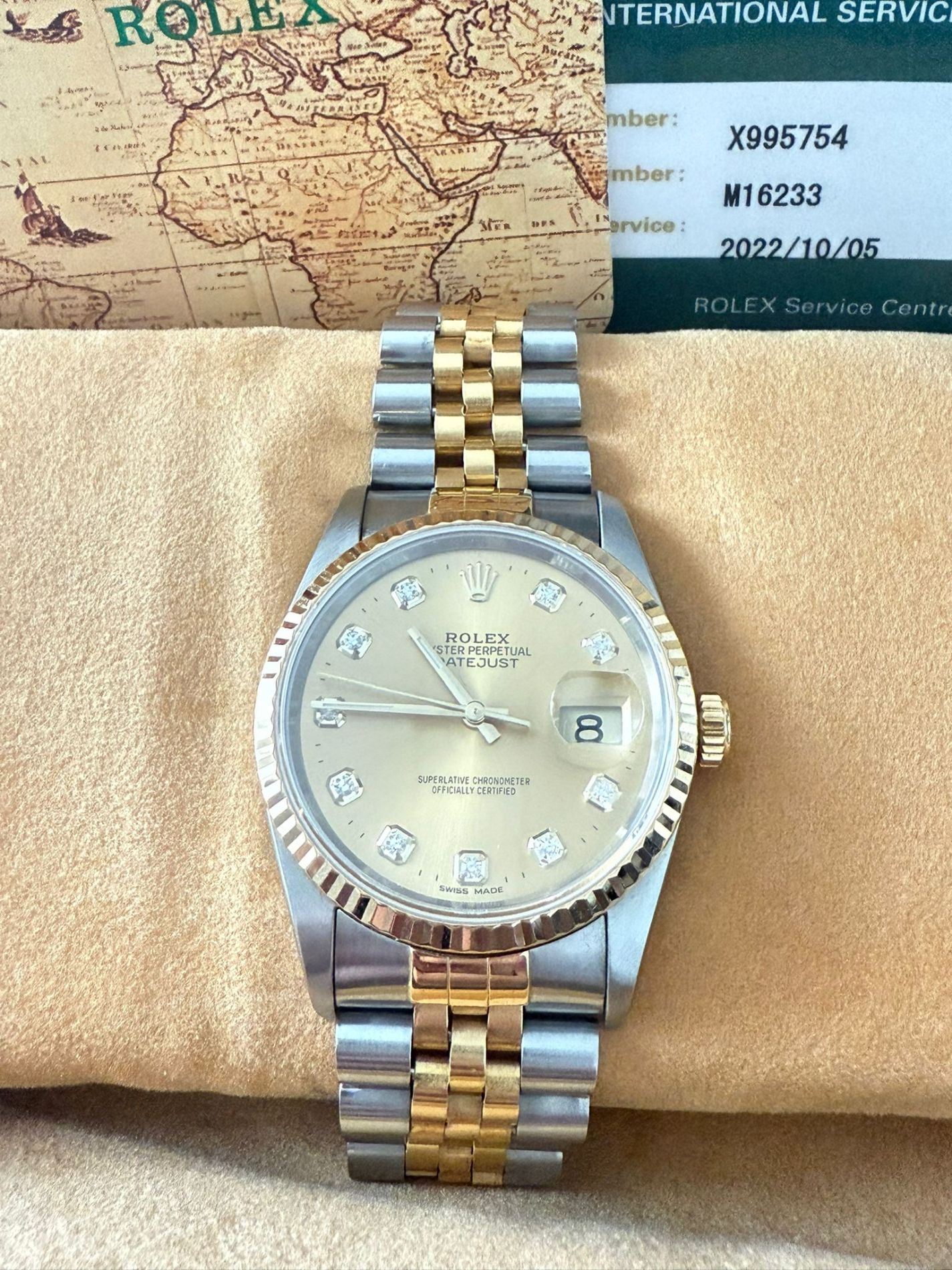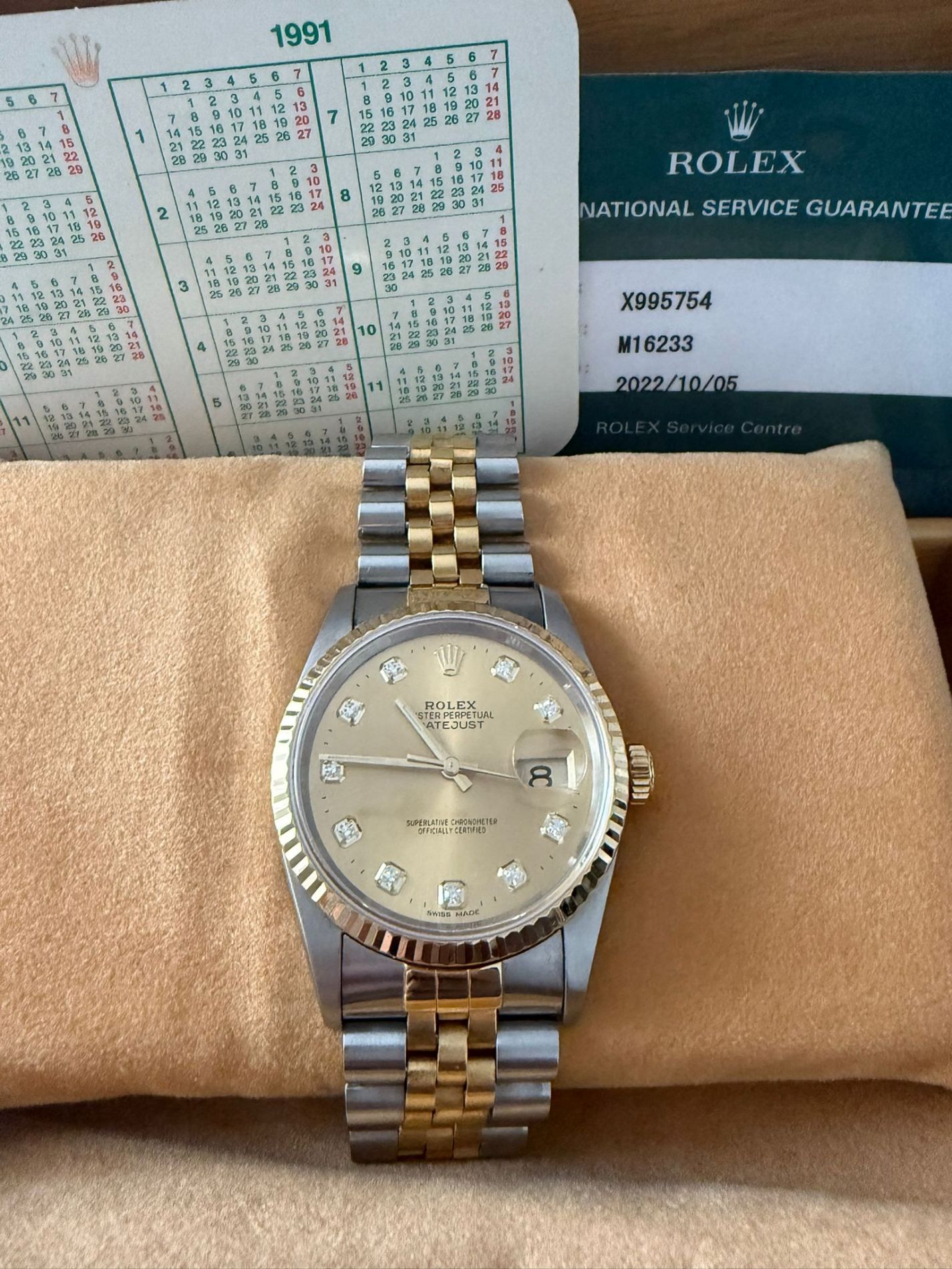 Marca Rolex Modello (Orologio) Datejust 36 Numero di referenza 16233 Carica Automatico Materiale della cassa Oro/Acciaio Materiale cinturino Oro/acciaio Anno 1991 Condizione Usato (Ottimo) L'articolo presenta segni di usura lievi, come ad esempio graffi leggeri, ma non percepibili al tatto. Corredo Senza documenti originali, no box la scatola utilizzata solo per fotografie non in vendita Service Rolex nel 2022 Diametro 36 mm Impermeabile 10 ATM Materiale lunetta Oro giallo Vetro Vetro zaffiro Cinturino Materiale cinturino Oro/acciaio Colore cinturino Oro/acciaio Chiusura Déployante Materiale chiusura Acciaio Funzioni Data